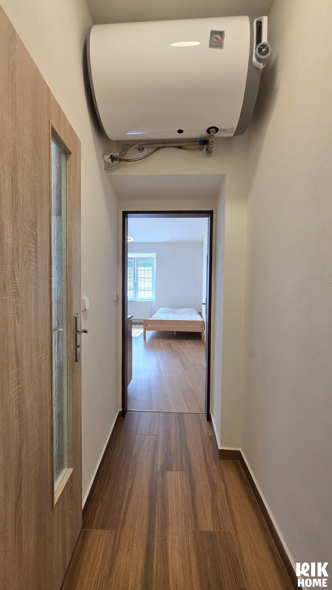 Dispozice bytu sestává ze vstupní předsíně, hlavní obytné místnosti s kuchyňským koutem a koupelny. Prostor kuchyně je osazen moderní kuchyňskou linkou, která je plně vybavena spotřebiči: varnou deskou, digestoří, mikrovlnnou troubou, volně stojící kombinovanou chladničkou a integrovanou pračkou. Koupelna je vybavena sprchovým koutem, umyvadlem a toaletou. Ohřev vody spolehlivě zajišťuje elektrický bojler umístěný v chodbě. Podlahovou krytinu v obytné části tvoří plovoucí podlaha, v sociálním zařízení je položena dlažba.