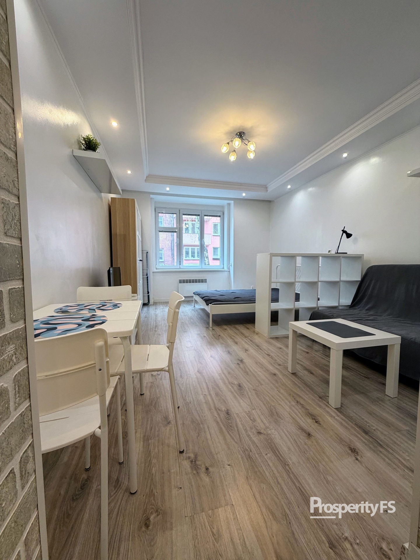 Dispozice bytu tvoří vstupní chodba, oddělený kuchyňský kout, koupelna, samostatné WC a obytný pokoj, který je opticky rozdělen na ložnici a obývací část.