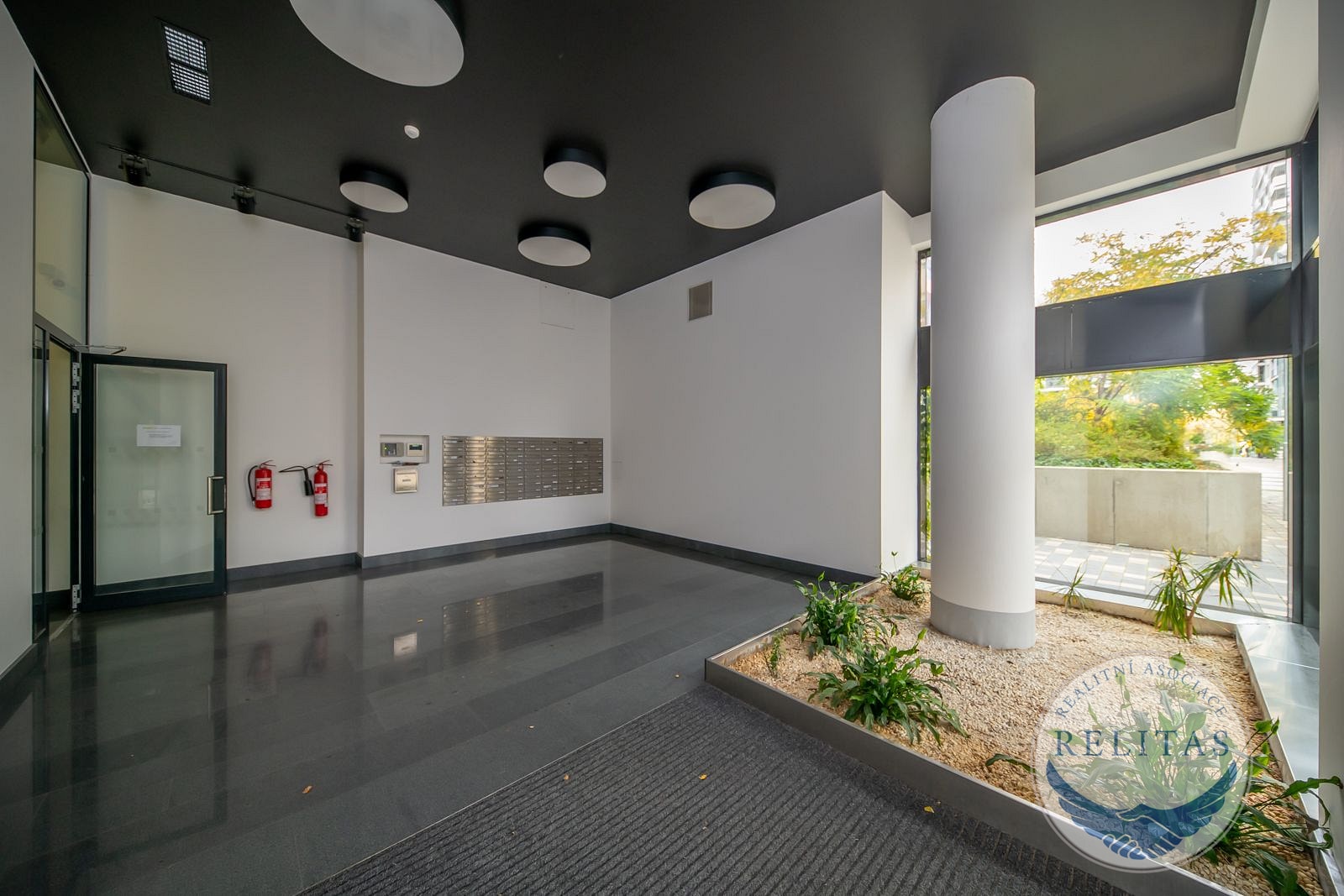 Srdcem bytu je obývací pokoj s kuchyňskou linkou, která je vybavena pečicí troubou, sklokeramickou varnou deskou a lednicí. Koupelna disponuje sprchovým koutem, toaletou a automatickou pračkou. Zásadní přidanou hodnotou této nemovitosti je prostorná lodžie. Vzhledem k umístění v devátém podlaží poskytuje soukromí a velkorysý panoramatický výhled na Prahu. Byt je momentálně kompletně zařízený nábytkem, majitel však nabízí flexibilitu a po vzájemné dohodě lze vybavení částečně odstěhovat.