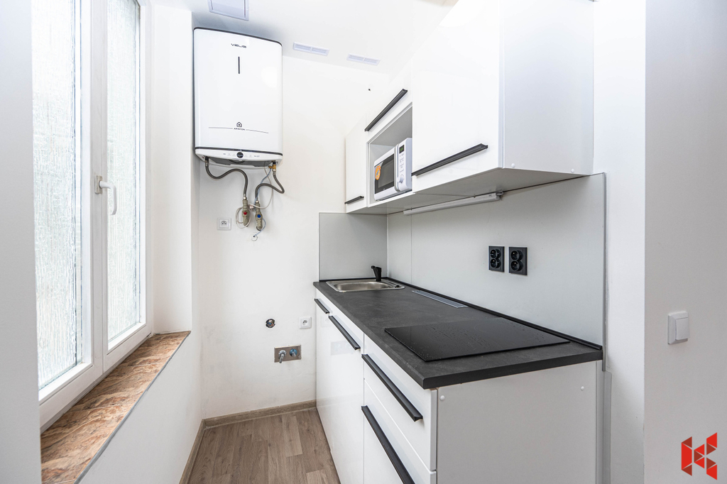 Pronajměte si dlouhodobě částečně vybavený světlý nový byt v blízkosti metra A Dejvická o velikosti 1+kk (30 m2), nacházející se v čtvrtém patře činžovního domu bez výtahu na adrese Rooseveltova 892/49, 160 00 Praha 6. Byt bude pronajímán přímo od majitele nájemní smlouvou v souladu s občanským zákoníkem na dobu 1 roku s možností prodloužení. Byt disponuje koupelnou se sprchovým koutem, umyvadlem, pračkou a wc, kuchyňským koutem s varnou deskou, lednicí a mikrovlnou troubou. Orientace bytu je na jih. Vytápění je řešeno lokálním plynovým topidlem, infra panely a topným žebříkem v koupelně. Ohřev vody bojlerem. Je zde k dispozici pro spoluužívání s ostatnímu obyvateli domu prostorná terasa s krásným výhledem. K bytu je potřeba vzít prostorné parkovací stání a sklep v suterénu domu za 2000,- Kč.