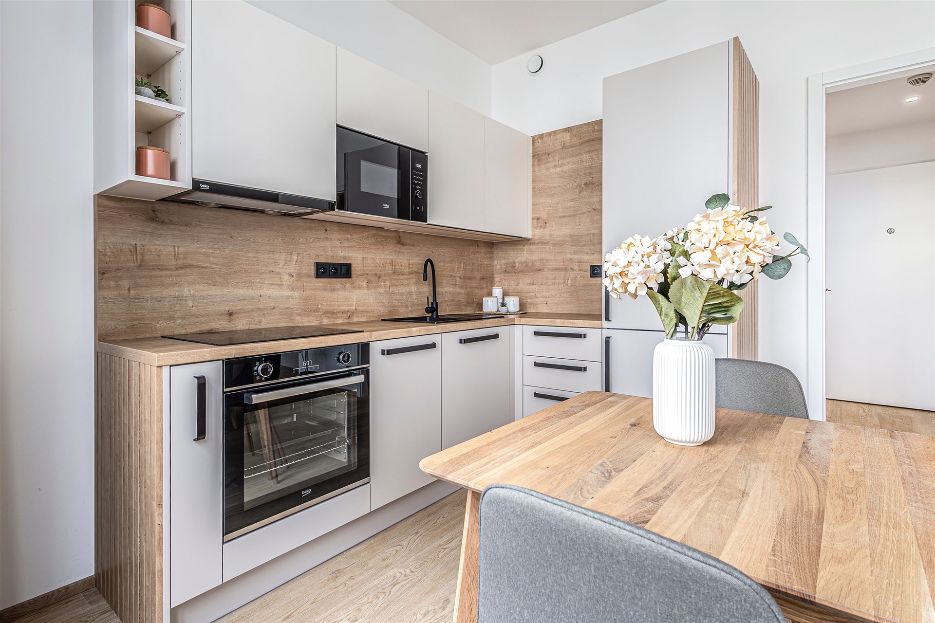 U vstupu do bytu se nachází předsíň s botníkem, šatní skříní s věšáky. Byt je vybaven vestavěnými skříněmi, kuchyňskou linkou s vestavěnými spotřebiči (mikrovlnná trouba, lednice, myčka, indukční varná deska, horkovzdušná trouba, varná konvice), jídelním stolem, židlemi, sedačkou, konferenčním stolem, komodou a SMART televizí. V pokoji se nachází dvoulůžková postel s matracemi, noční stolky a vestavěná skříň. V koupelně se nachází sprchový kout a pračka se sušičkou.