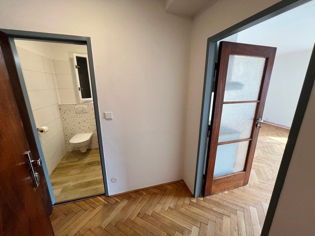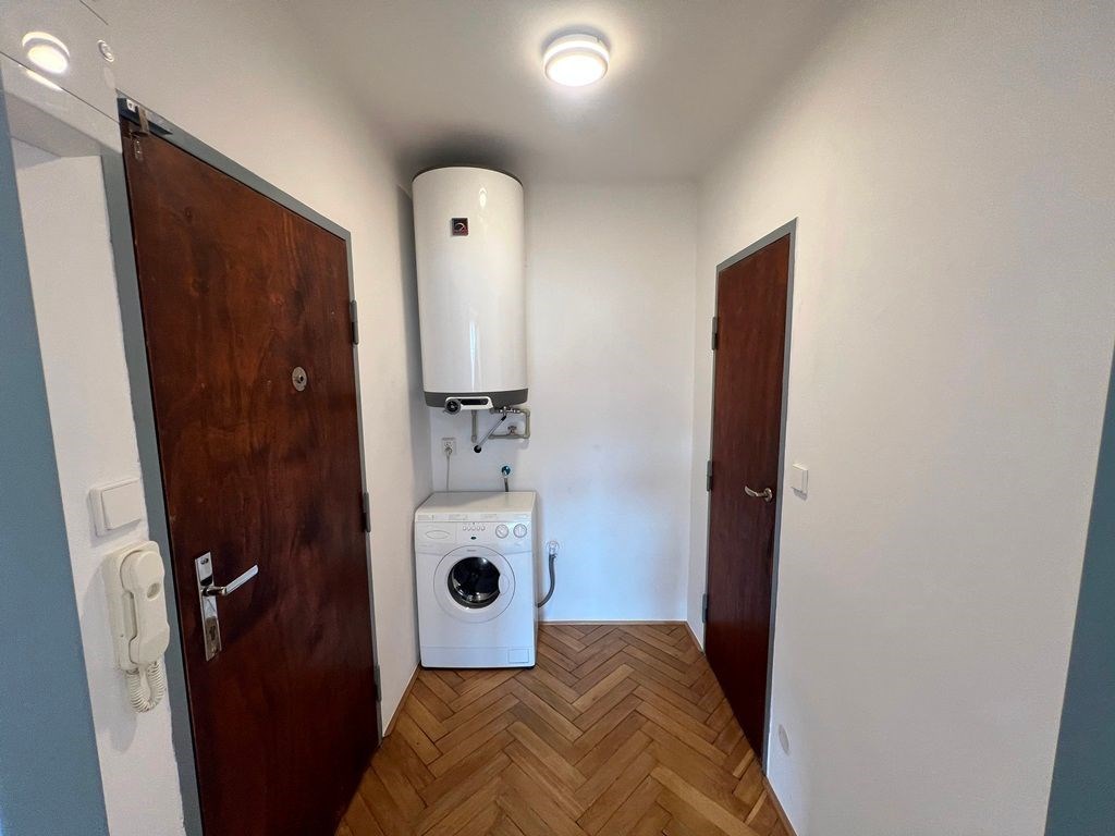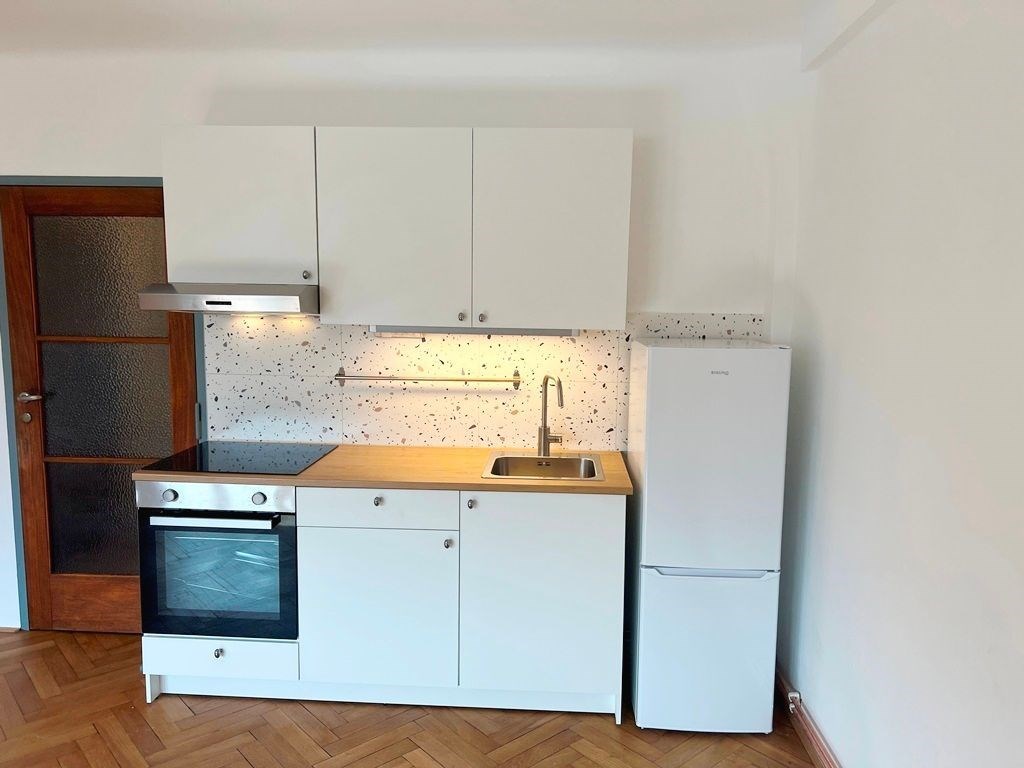 Dispozičně je byt rozdělen na vstupní chodbu, ze které je samostatný vchod do koupelny spojené s WC a do obytné místnosti, kde je umístěna i kuchyňská linka. V předsíni je umístěn bojler a pračka. V předsíni je i prostor vhodný pro botníkovou a šatní stěnu. Závěsné WC je umístěno v koupelně, je zde vana se zástěnou a umyvadlo se závěsnou skříňkou. V obytném pokoji je kuchyňská linka s varnou deskou, dřezem, troubou a digestoří. Na ní navazuje samostatně stojící lednice s mrazákem, na které je prostor i pro mikrovlnnou troubu. Okno je velké, opatřené roletami, orientované na jih do dvora domu, tedy je zaručeno velmi klidné a slunné bydlení. Všechny zařizovací předměty, obklady, kuchyňská linka i veškeré spotřebiče jsou nové. Zdi nově vyštukované po výmalbě, parkety po kompletní renovaci.