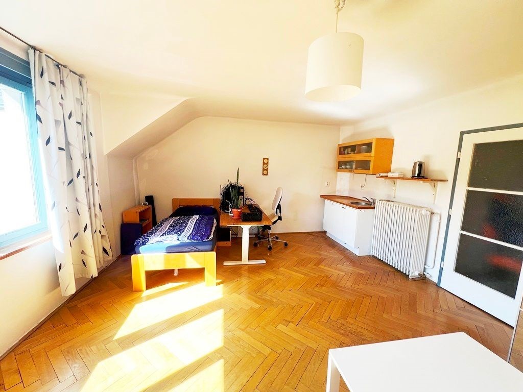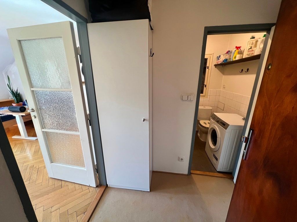Dispozičně je byt rozdělen na vstupní chodbu, ze které je samostatný vchod do koupelny spojené s WC a do obytné místnosti, kde je umístěna i menší kuchyňská linka. Bojler je umístěn nad vanou a v koupelně je prostor pro úzkou pračku. V předsíni je skříň a prostor pro botník či šatní stěnu. WC je umístěno v koupelně, je zde vana a umyvadlo. V obytném pokoji je menší kuchyňská linka se dřezem a přenosným elektrickým vyřičem. Lednice je aktuálně umístěna v předsíni. Okno je velké, orientované na jih, do dvora domu, tedy je zaručeno velmi klidné a slunné bydlení. Byt je po vymalování, parkety v obytné místnosti zachovalé, v předsíni lino.