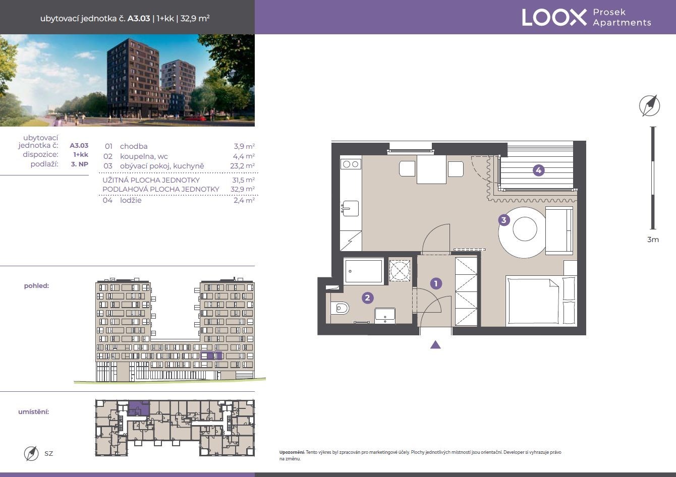 Nabízíme k pronájmu kompletně vybavený byt o dispozici 1+KK s výměrou 33 m2 a lodžií 2,4 m2 ve 3.NP v 11patrovém bytovém domě LOOX přímo u metra Prosek.