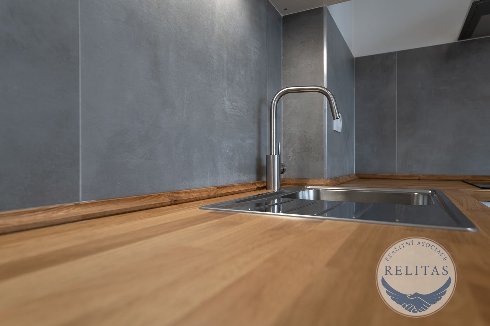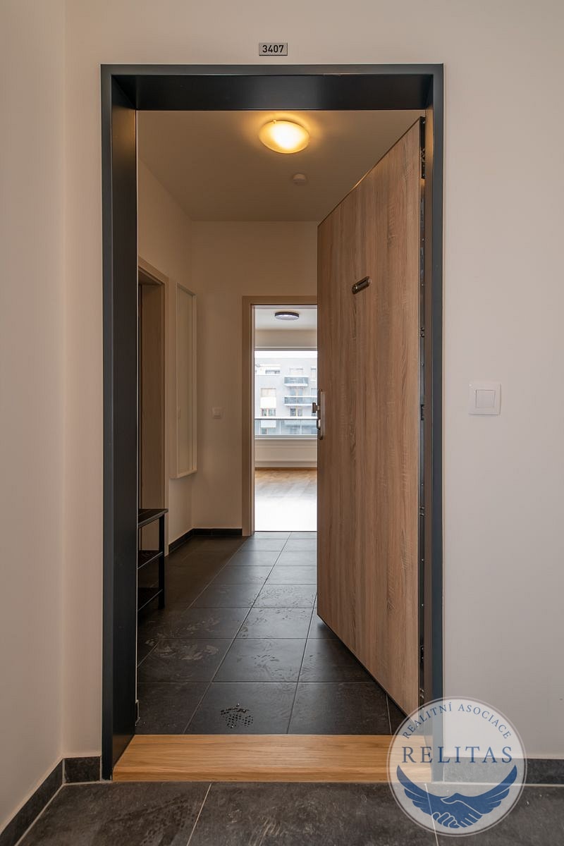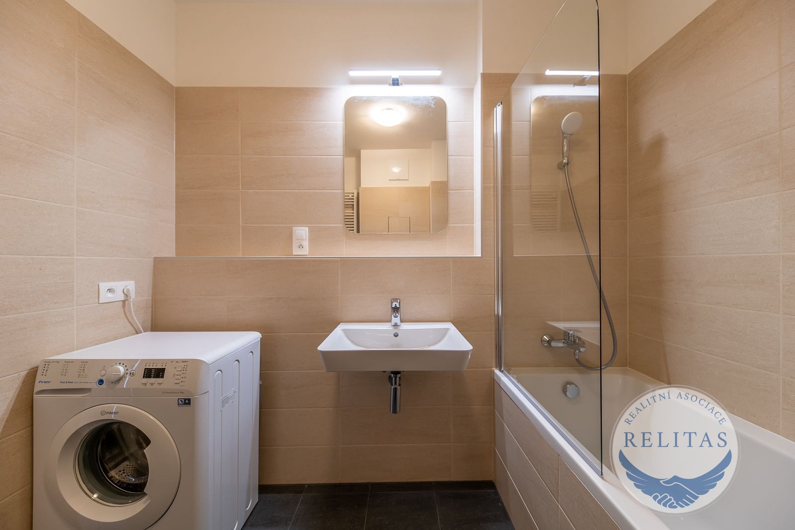 Světlému interiéru dominuje hlavní obytná místnost s novou kuchyňskou linkou. Ta disponuje vestavnými spotřebiči, konkrétně myčkou nádobí, pečicí troubou, sklokeramickou varnou deskou a lednicí. Koupelna je navržena s vanou a její součástí je také pračka. Z obývacího prostoru vede přímý vstup na balkon, který přirozeně rozšiřuje užitnou plochu bytu.