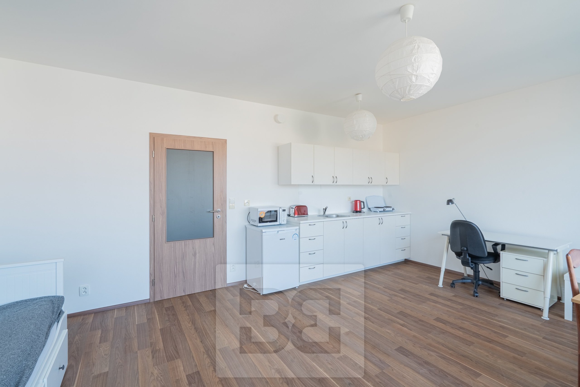 Byt je pronajímán vybavený. V hlavní místnosti se nachází rozkládací pohovka, kuchyňská linka, lednice, křeslo, pracovní stůl a jídelní stůl.