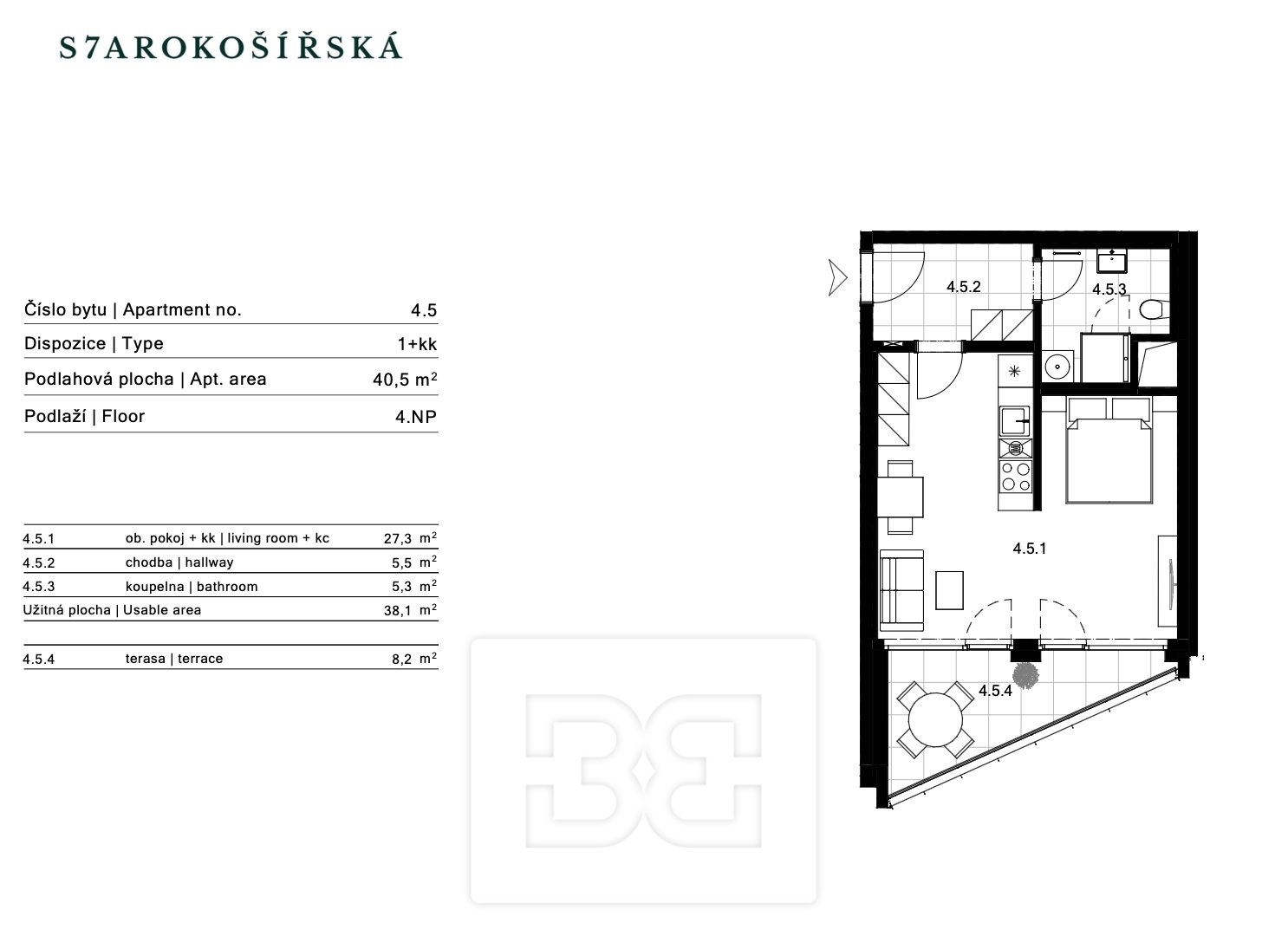 Byt se nachází ve 4. patře právě dokončené novostavby v atraktivní lokalitě Prahy 5 – Košíře, v rezidenčním projektu Starokošířská 7. Interiér je proveden ve vysokém standardu.