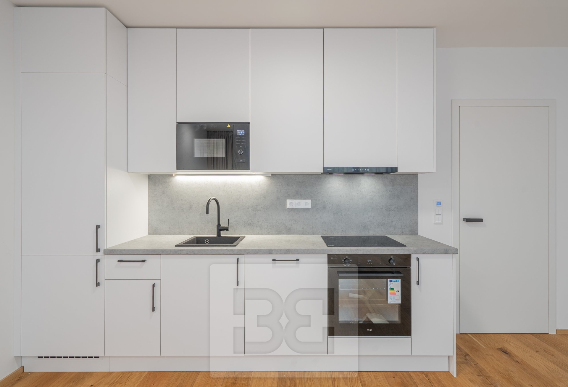 Součástí bytu je moderní kuchyňská linka vybavená spotřebiči (myčkou nádobí, lednicí, digestoří, mikrovlnnou troubou a pečicí troubou). V celé místnosti jsou položeny krásné dřevěné podlahy, které podtrhují celkově kvalitní charakter interiéru. Velká okna s designovými závěsy zajišťují dostatek denního světla a příjemnou atmosféru.