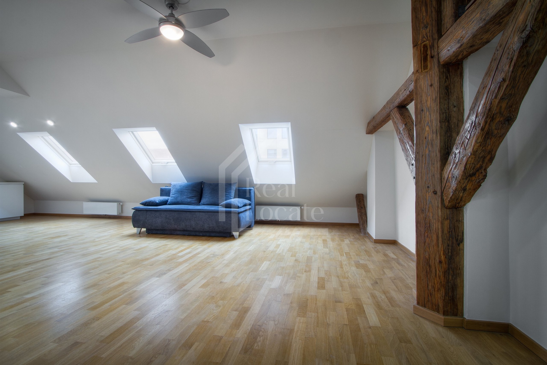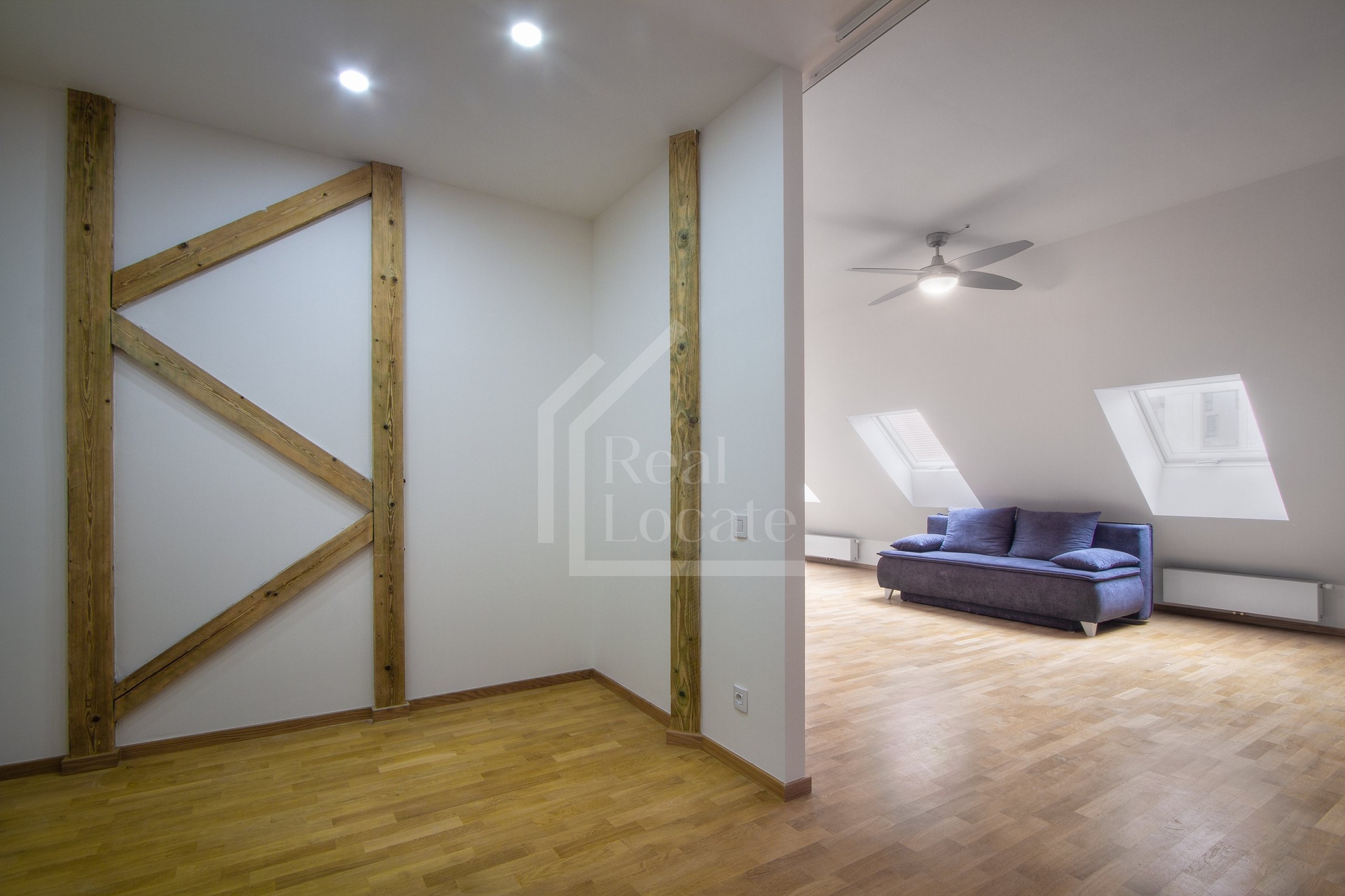 Jedná se o podkrovní byt o celkové rozloze 63m2 s orientací do vnitrobloku, což umožňuje dostatek klidu od ruchu velkoměsta. V bytě je dostatek denního světla. Vybavení bytu je velice vkusné a elegantní doplněné krásnými krovy. Byt je chytře oddělen na různé sekce - ložnice je přepážkou oddělená od obývacího pokoje a kuchyňského koutu. Koupelna je dostatečně velká s vanou.