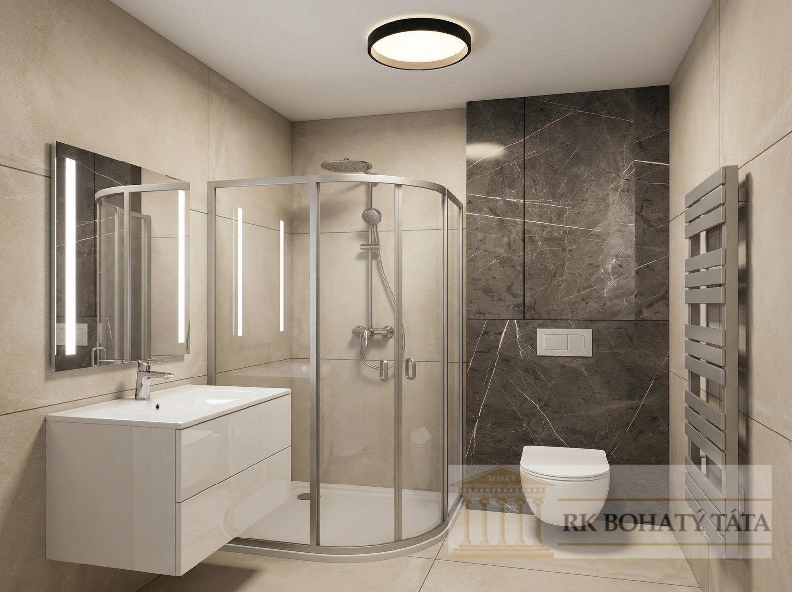 • kvalitní obklady v neutrálních tónech, které působí velmi elegantně.