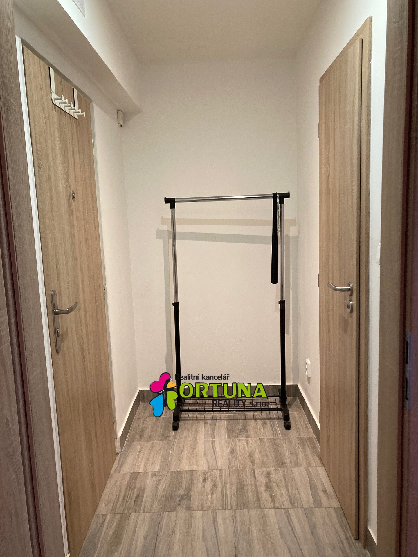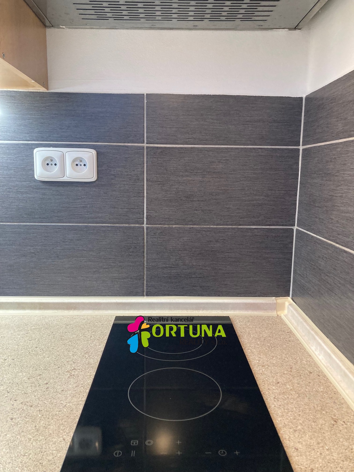 Nabízíme k pronájmu vkusně zrekonstruovaný a částečně zařízený byt 1+kk v 5. patře panelového domu. Byt byl kompletně rekonstruován v r. 2016 - jádro bytu (Ytong), rozvody vody v plastu, elektřina v mědi. Z předsíně je přímý vstup do koupelny se sprchovým koutem, pod umyvadlem je umístěna pračka a po straně je toaleta. Prostorný pokoj je propojený s kuchyňským koutem, který je prakticky oddělen od hlavního prostoru. Je vybavený vestavěnými spotřebiči - digestoří, lednicí a dvouplotýnkovou sklokeramickou varnou deskou. Okna včetně lodžie (6,5 m2) směřují do zeleně. Úložný prostor zajištuje komora o výměře cca 1 m2 umístěná vedle vchodu do bytu.