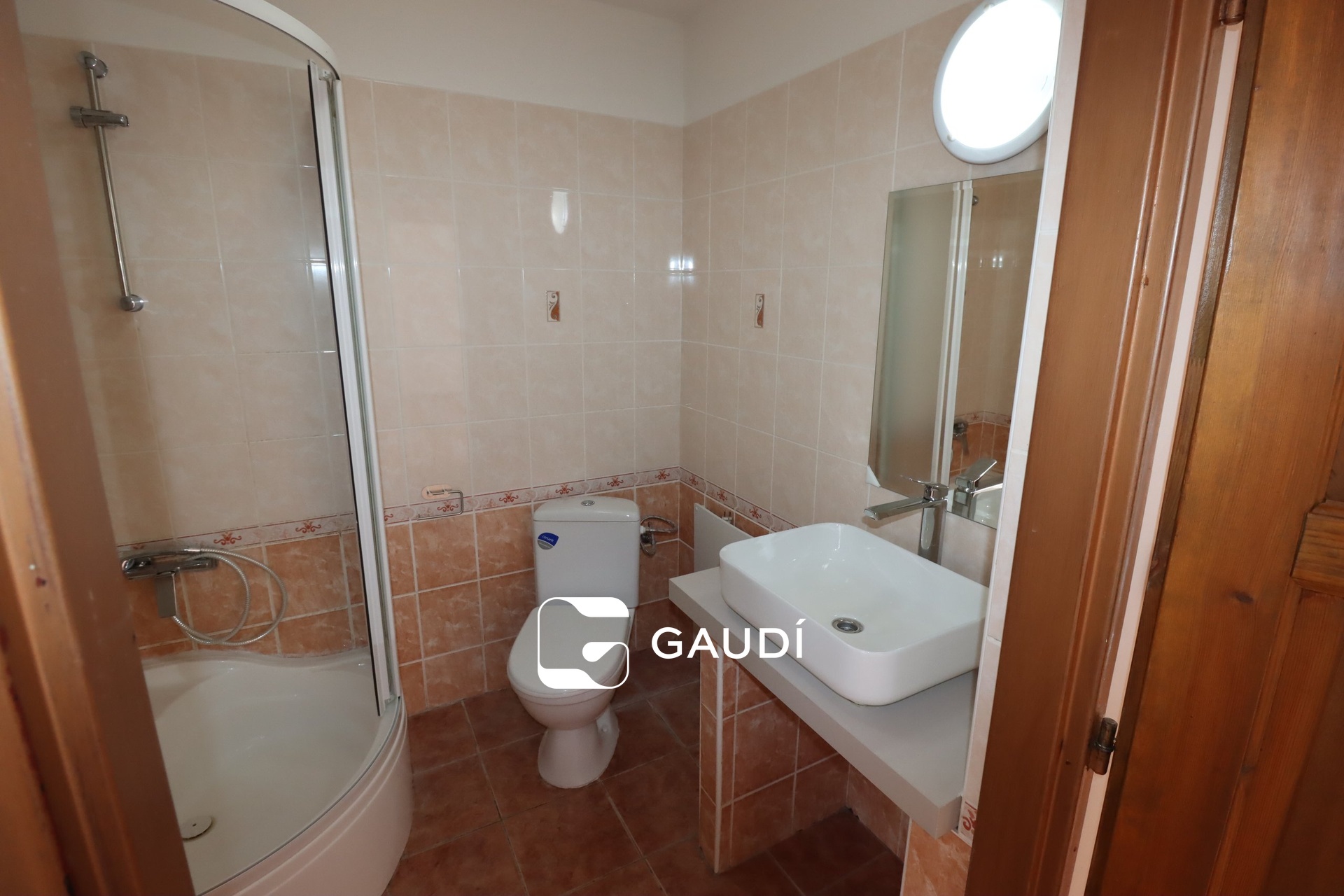 V koupelně se sprchovým koutem, umyvadlem se zrcadlem a WC se nachází místo pro pračku.