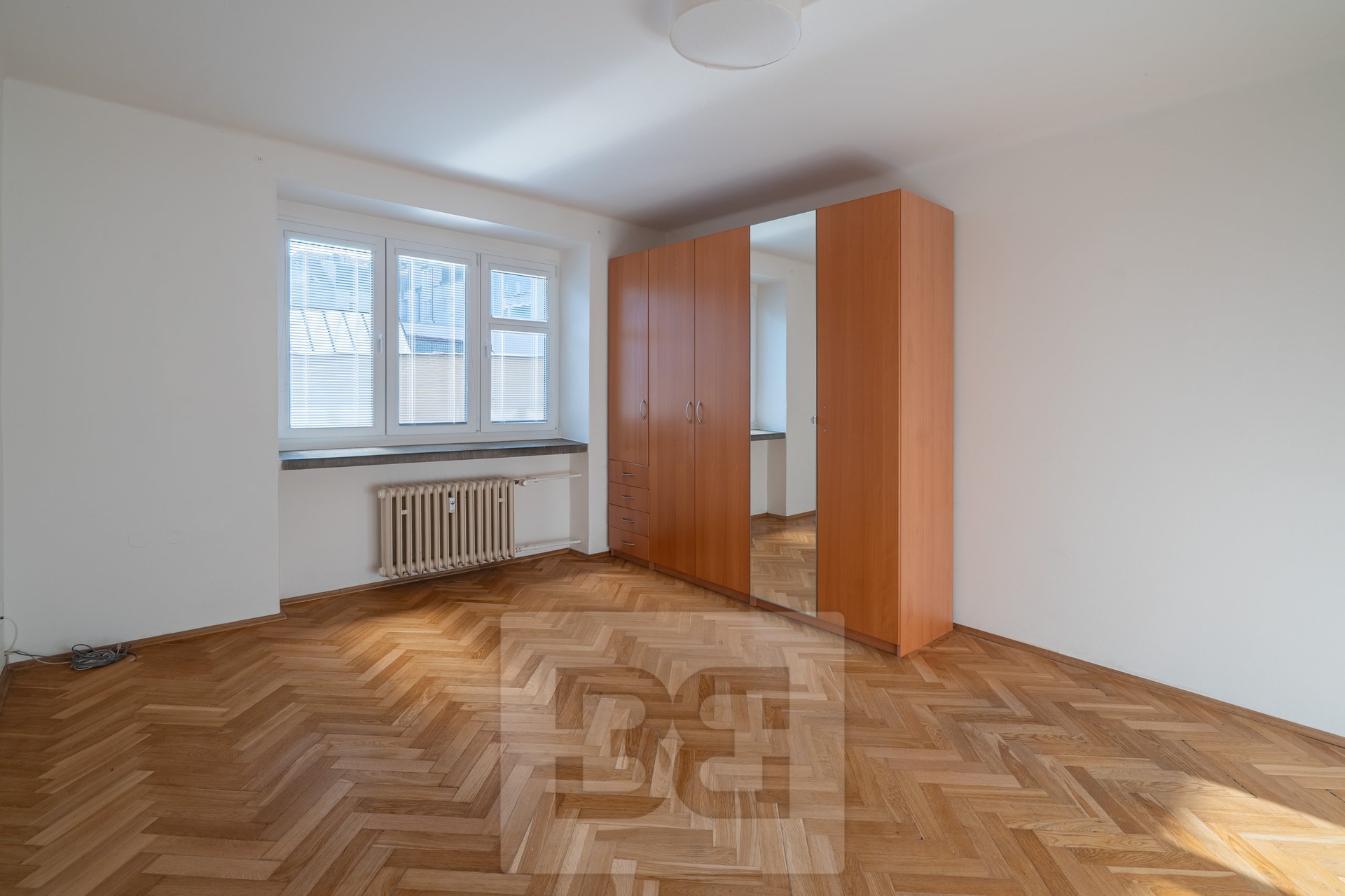 Byt je orientován na jih, díky čemuž je po celý den příjemně prosvětlený. Dispozice je velmi praktická – dva samostatné pokoje s krásně zachovanými parketami poskytují dostatek prostoru. V jednom pokoji je k dispozici šatní skříň, ve druhém knihovna. Byt se jinak nabízí nevybavený.
