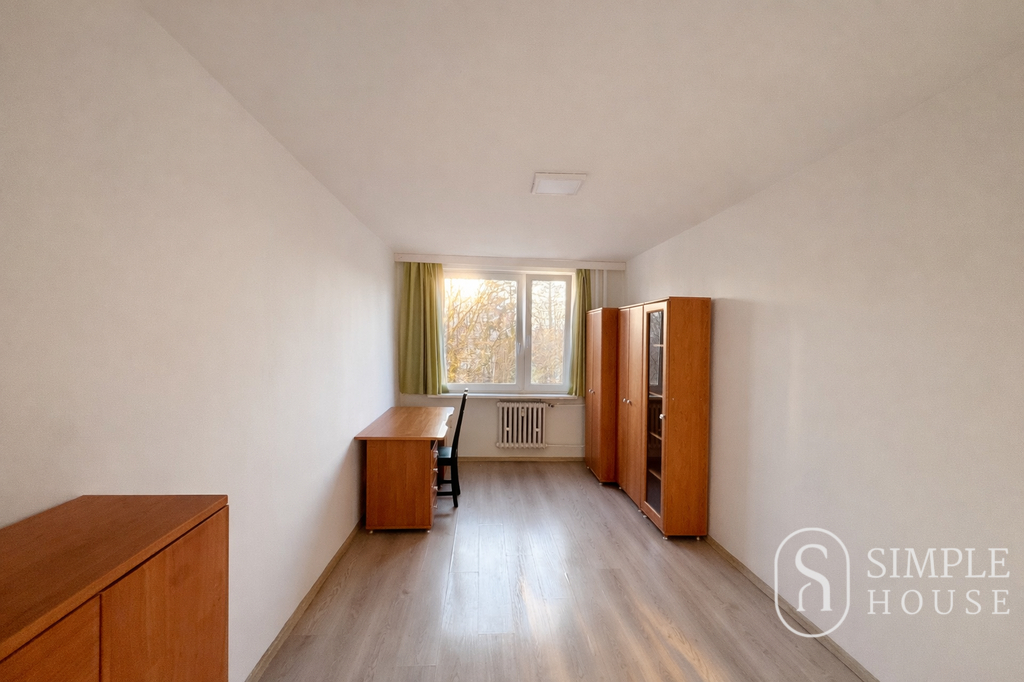 Dispozice bytu zahrnuje samostatnou kuchyni, prostorný obývací pokoj a oddělenou ložnici. Kuchyně je vybavena kuchyňskou linkou, sporákem, troubou a lednicí. Obývací pokoj je světlý a vzdušný, ložnice poskytuje dostatek soukromí a klidné zázemí pro pohodlné bydlení.