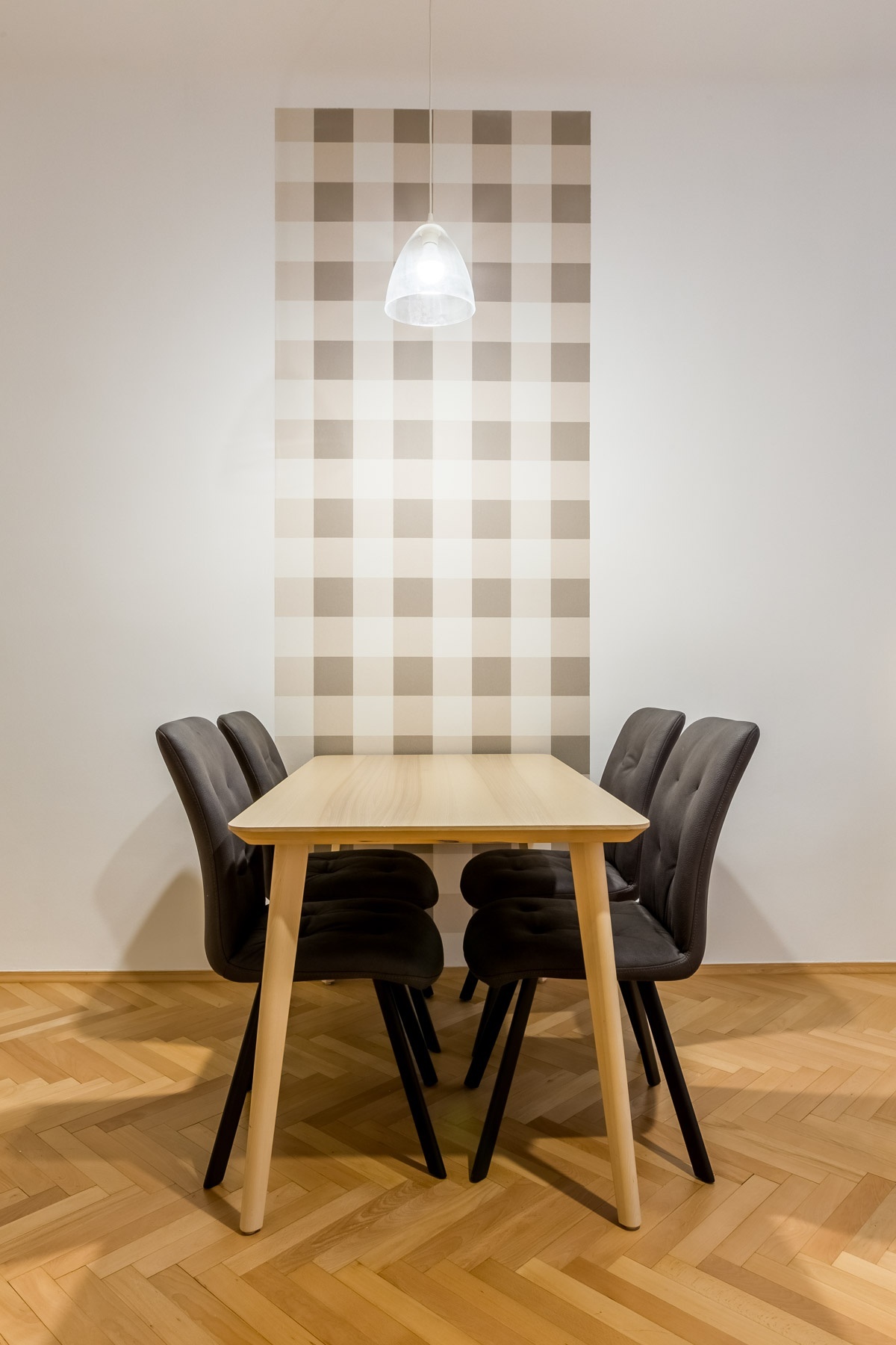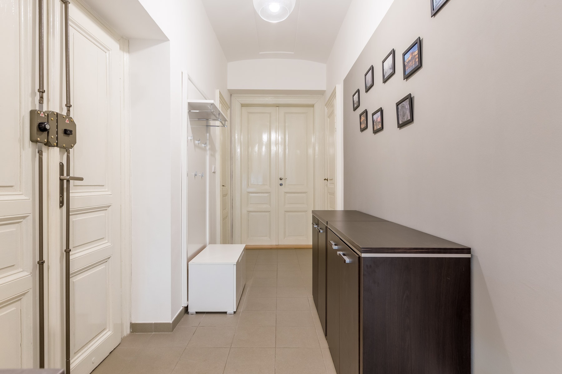 Byt se sestává z obývacího pokoje s okny do klidné ulice Na Smetánce. Nová kuchyň, která se nachází na prostorné chodbě a ložnice jsou orientovány do vnitrobloku.