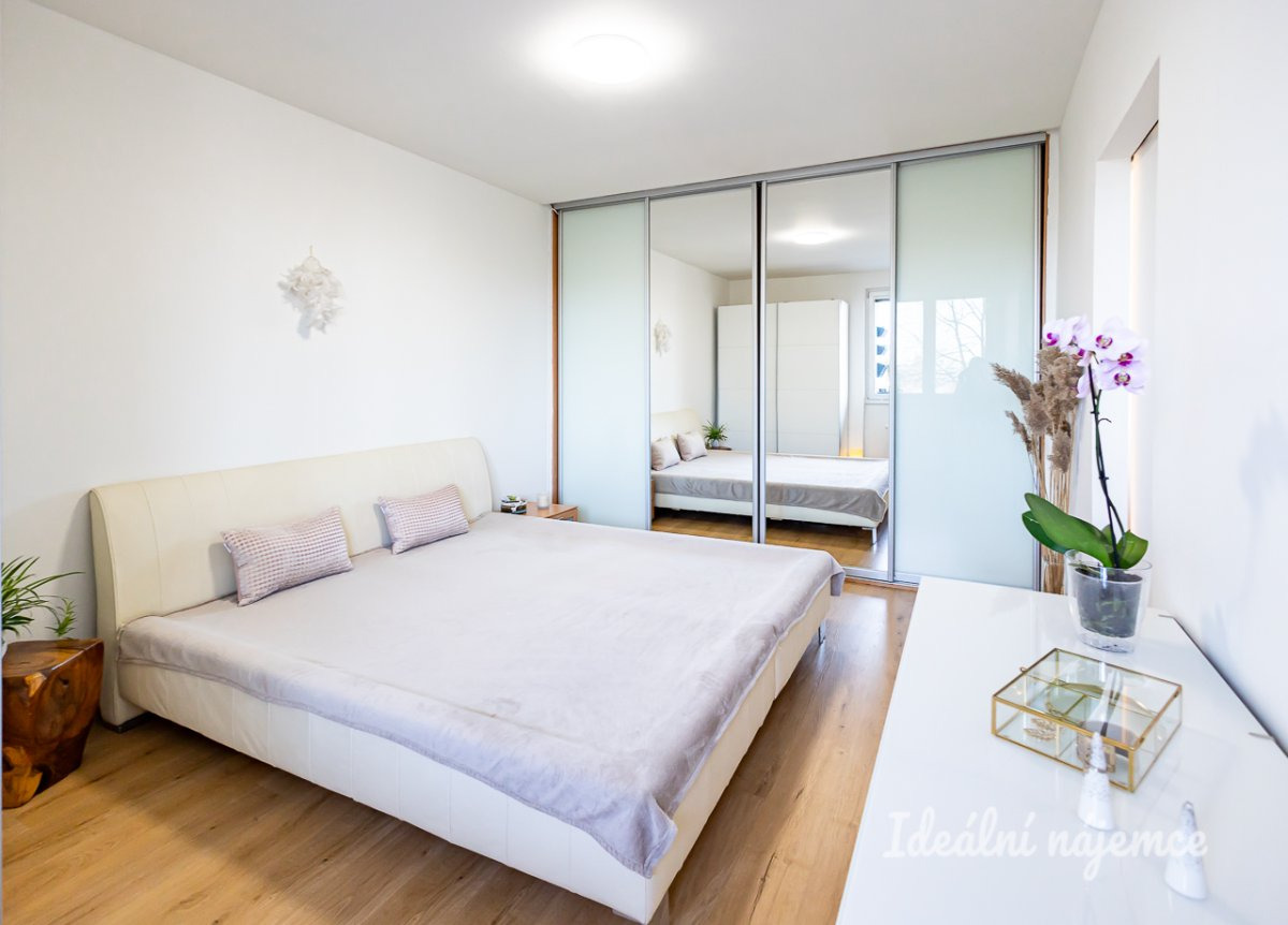 Na obývací pokoj navazuje ložnice vybavena velkou vestavnou šatní skříní, volně stojící skříní prostornou komodou a kompletní postelí.