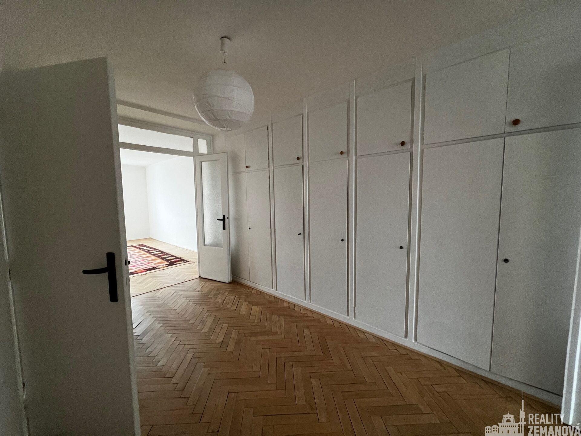 Světlý a prostorný byt v původním, ale udržovaném stavu s nachází v 5. patře s novým výtahem. Dispozice bytu: větší předsíň se vstupem do kuchyně, do komory, na WC/samostatné a bez dveří do velké společenské místnosti/haly bez oken se řadou vestavěných skříní. Z této místnosti se vstupuje do koupelny a do dvou protilehlých prostorných pokojů s orientací východní a západní, s volným výhledem. Kuchyň je vybavena linkou s novou vestavěnou myčkou, novým sporákem s el. troubou, lednicí s mrazákem a má vlastní spíž.