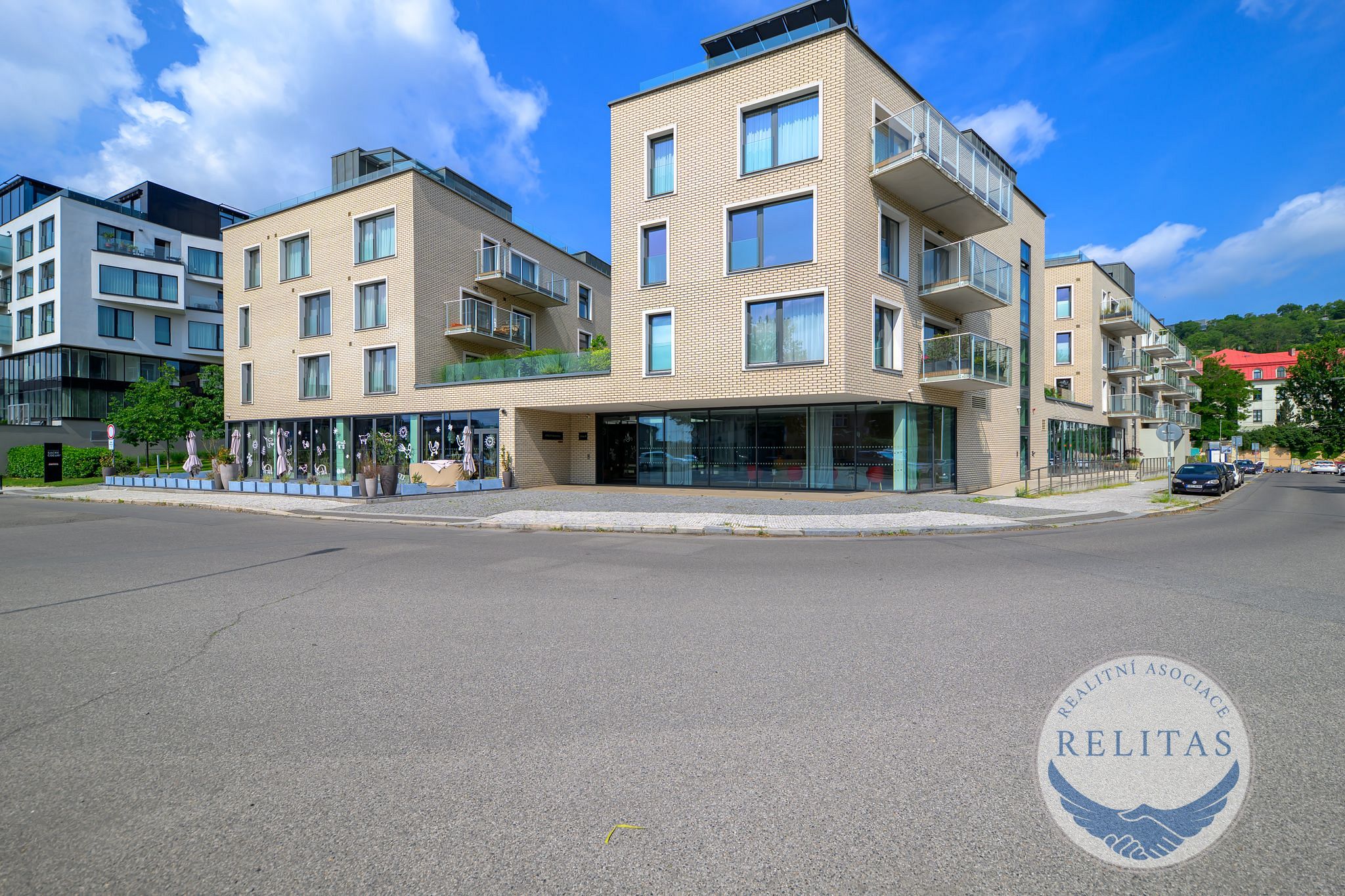 Náročnějšímu nájemci zprostředkuji byt 2+kk, 74, 8, m² + dva balkony v 3. podlaží v projektu Vitality Rezidence – nadstandardně řešené novostavbě z roku 2020, umístěné na Praze 5 – Smíchov, v Kobrově ulici, mezi parkem Sacré Coeur a klášterem svatého Gabriela. Byt se sestává z předsíně s šatní skříní, obývacího pokoje s kuchyňským koutem (42 m²), ložnice s dvoulůžkem (14 m²) a koupelny s vanou, toaletou a pračkou (vizte, prosím, půdorys). Z obývacího pokoje ústí jeden balkon s krásným výhledem na klášter (severozápad), druhý balkon z ložnice (jihozápad), obývací pokoj je orientován na severovýchod. V celém bytě je parketová podlaha. Rezidenti domu mohou zdarma využívat fitness, společenskou místnost s kuchyní či přednáškový sál. Budova má výborný průkaz energetické náročnosti "B - velmi úsporná".