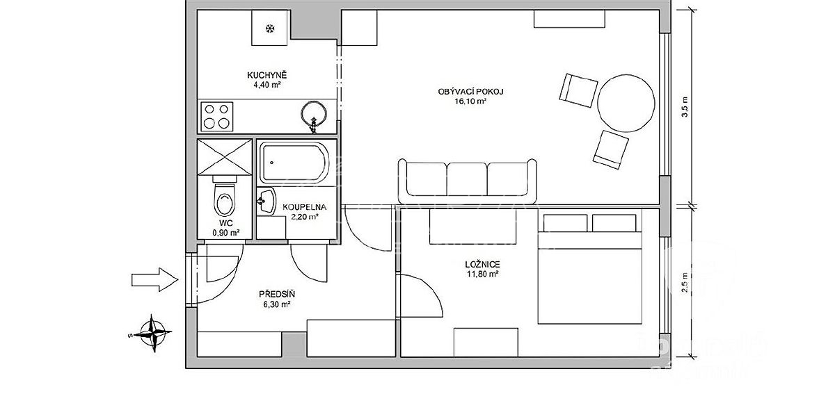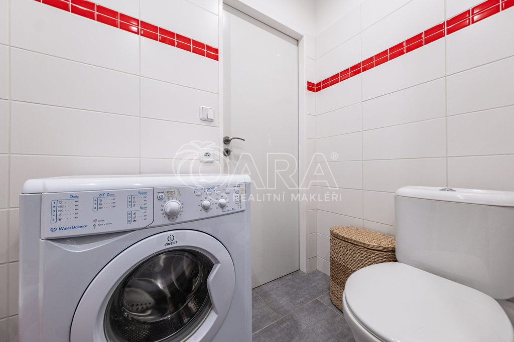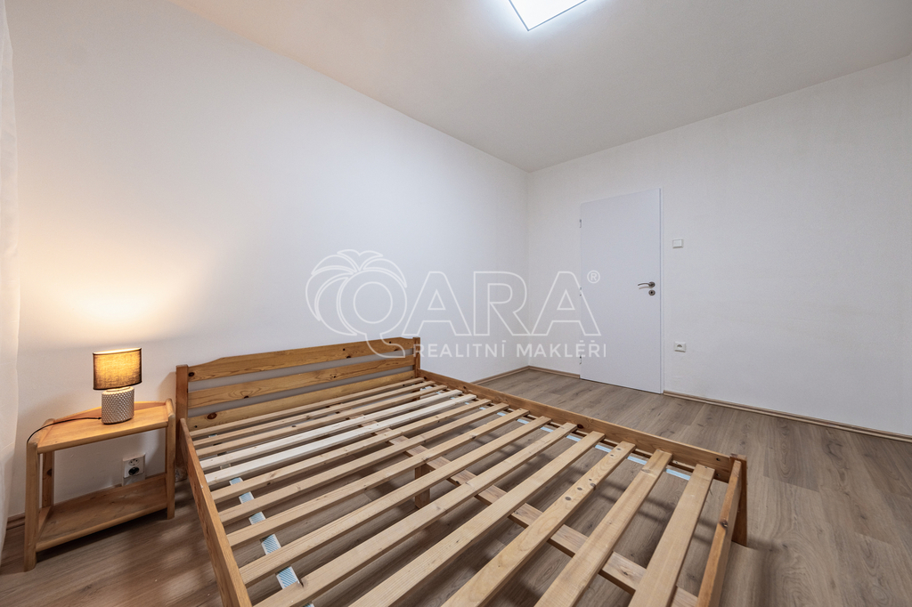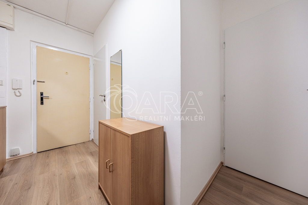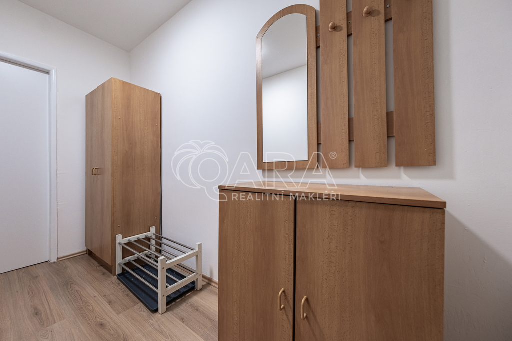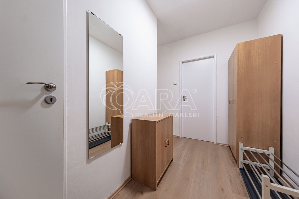 Z prostorné předsíně se vchází do všech místností v bytě. Koupelna je spojena s toaletou, vybavená je vanou a umyvadlem, zrcadlovou skříňkou, pračka k dispozici. Ložnice (12 m2) je vybavena postelí 160 x 200 cm a nočním stolkem.