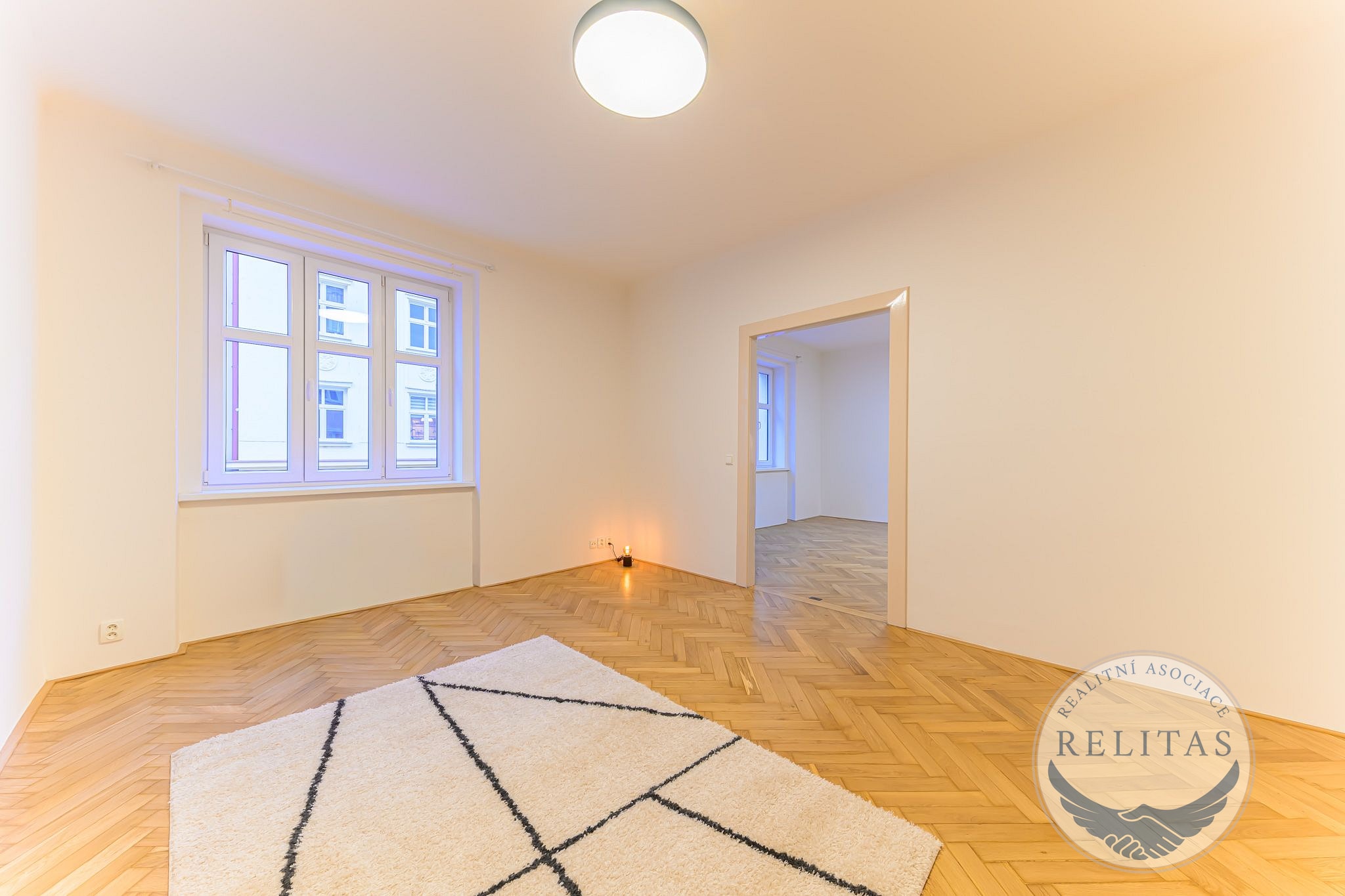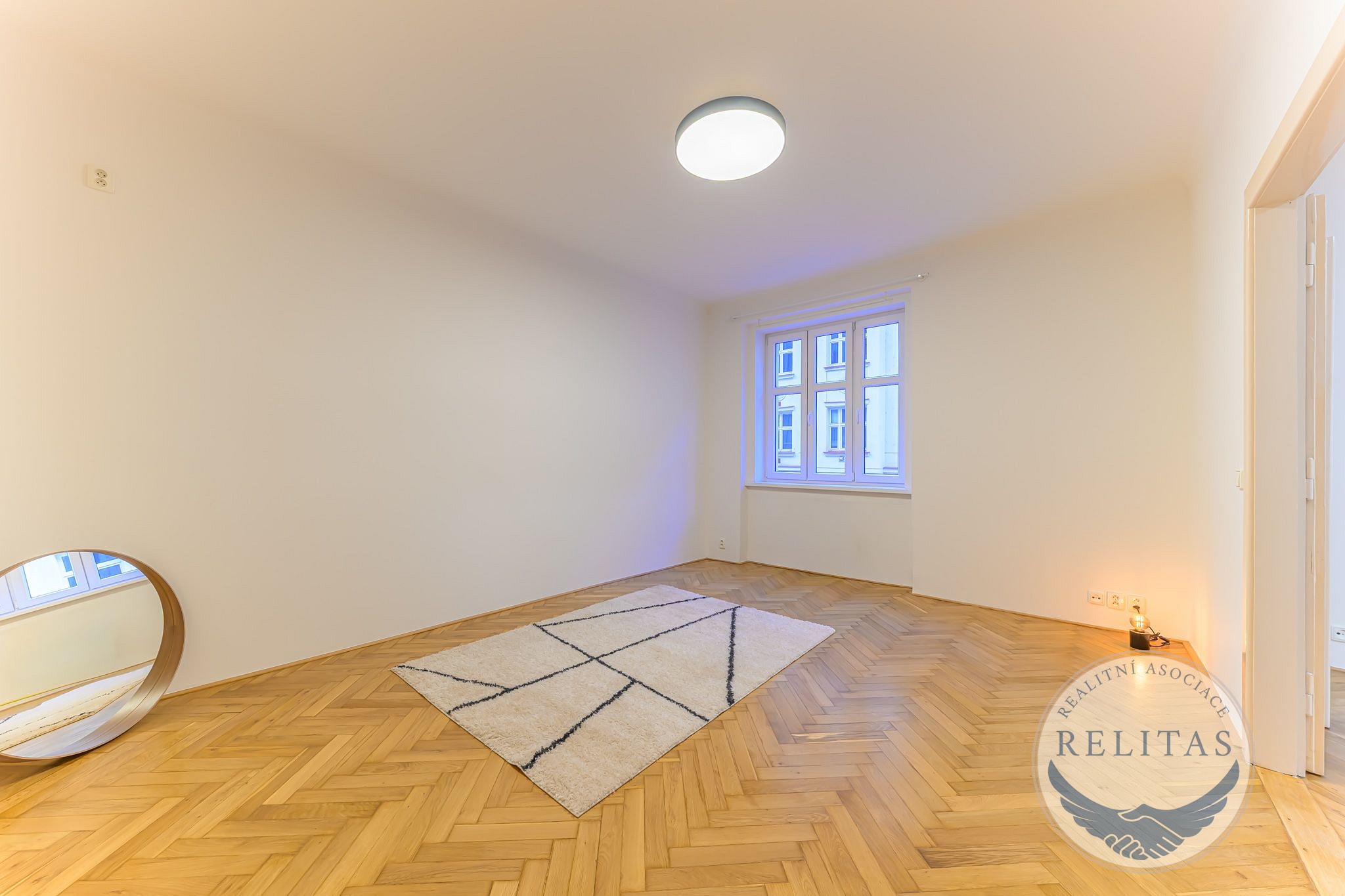 Dispozice bytu tvoří prostorný obývací pokoj s kuchyňským koutem, samostatná ložnice, koupelna se sprchovým koutem a toaletou a vstupní část. Dominantou bytu jsou krásné renovované parkety, vysoké stropy a dostatek denního světla, který bytu dodává vzdušnost a příjemnou atmosféru.