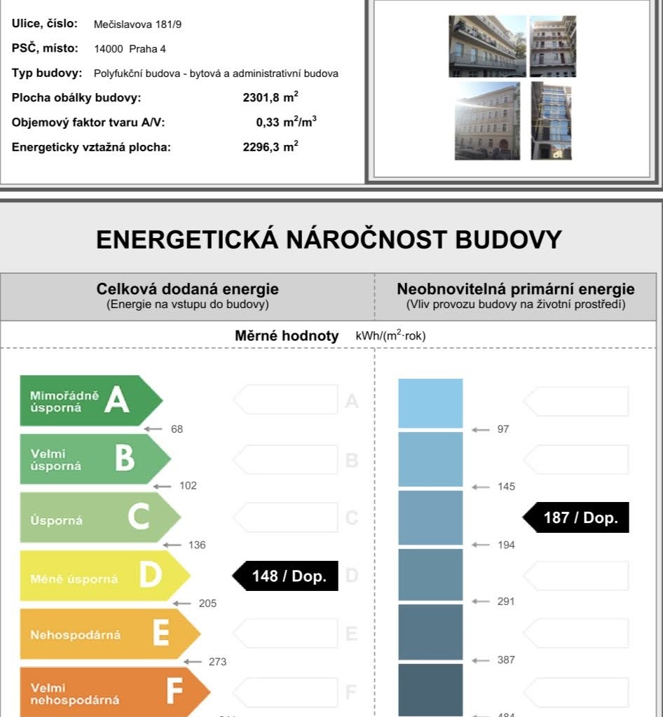 Ukazatel energetické náročnosti budovy:148 kWh/m²