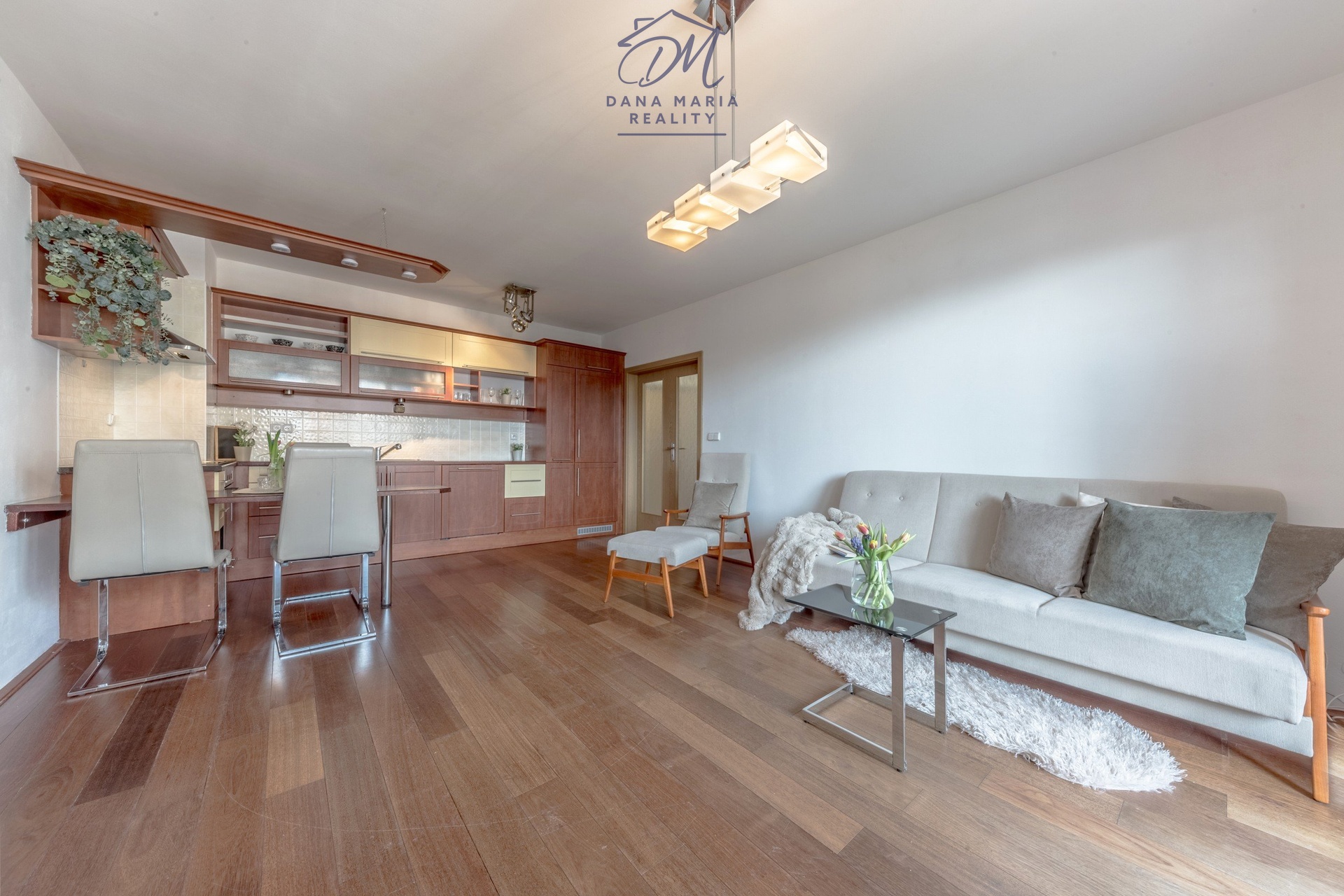Dispozice bytu je praktická a účelně řešená. Díky velkoformátovým oknům je interiér po celý den přirozeně prosvětlený a působí vzdušným dojmem. Obývací pokoj je propojen s kuchyňským koutem a jídelní částí, čímž vzniká harmonický obytný prostor vhodný jak pro každodenní život, tak pro setkávání s přáteli. Obývací část je vybavena gaučem, křeslem, komodou a konferenčním stolkem, jídelní kout nabízí jídelní stůl se židlemi. Z obývacího pokoje je přímý vstup na balkon.