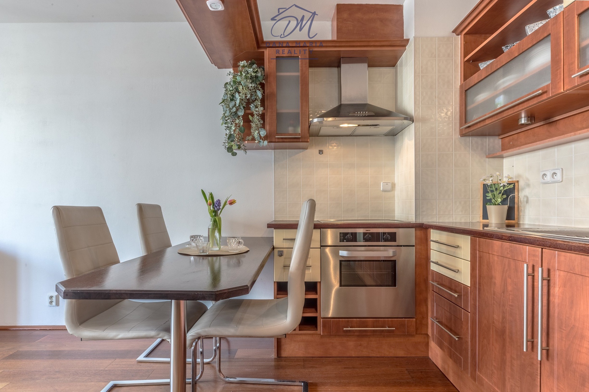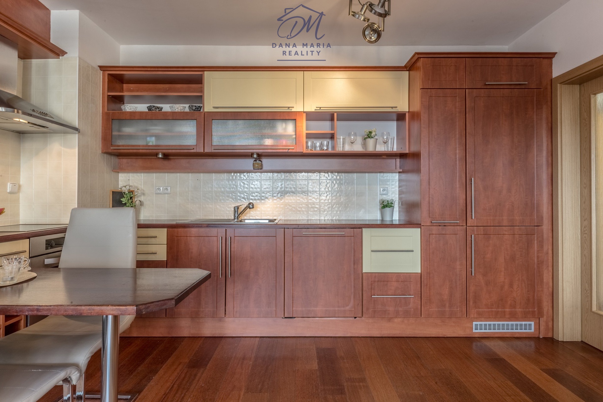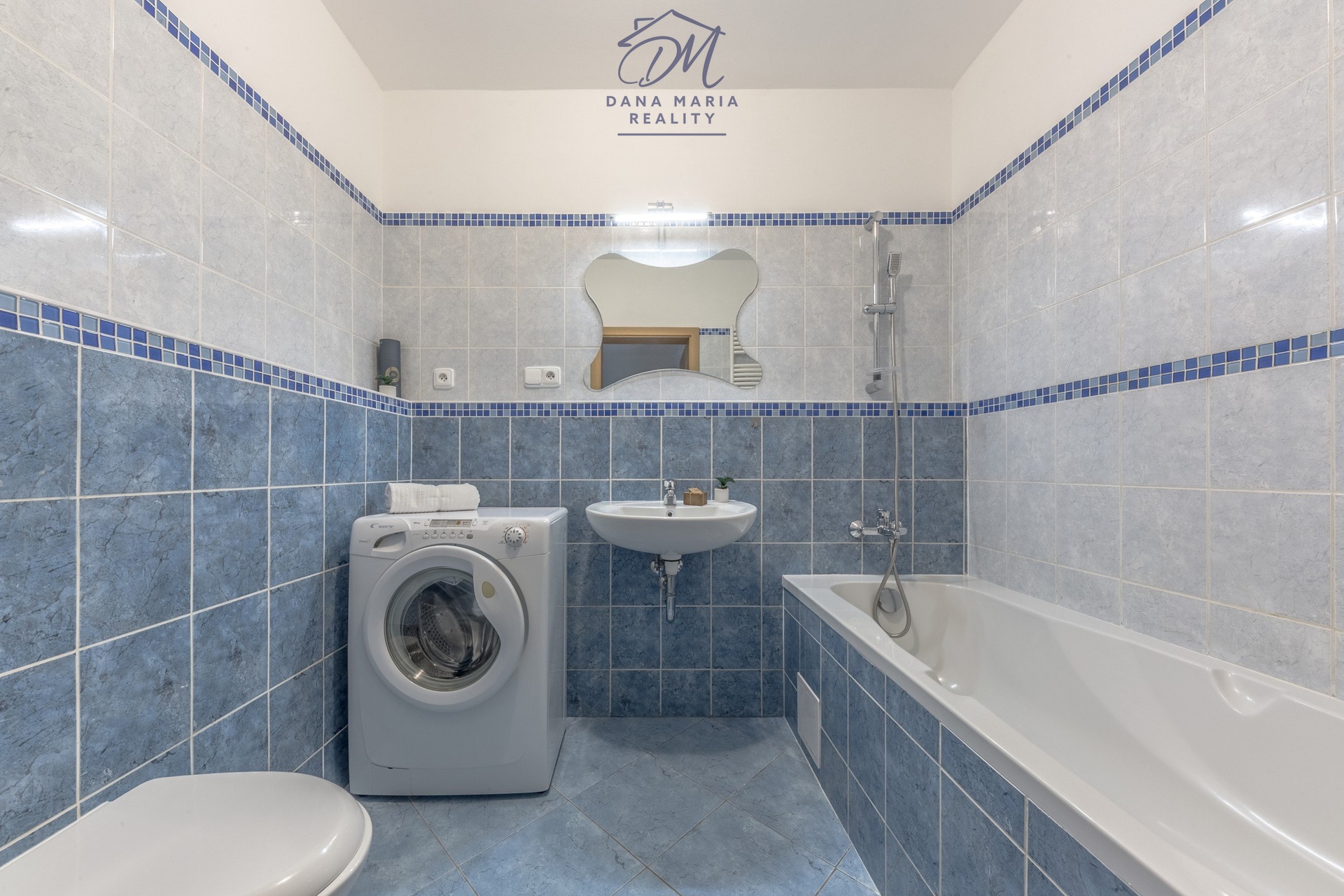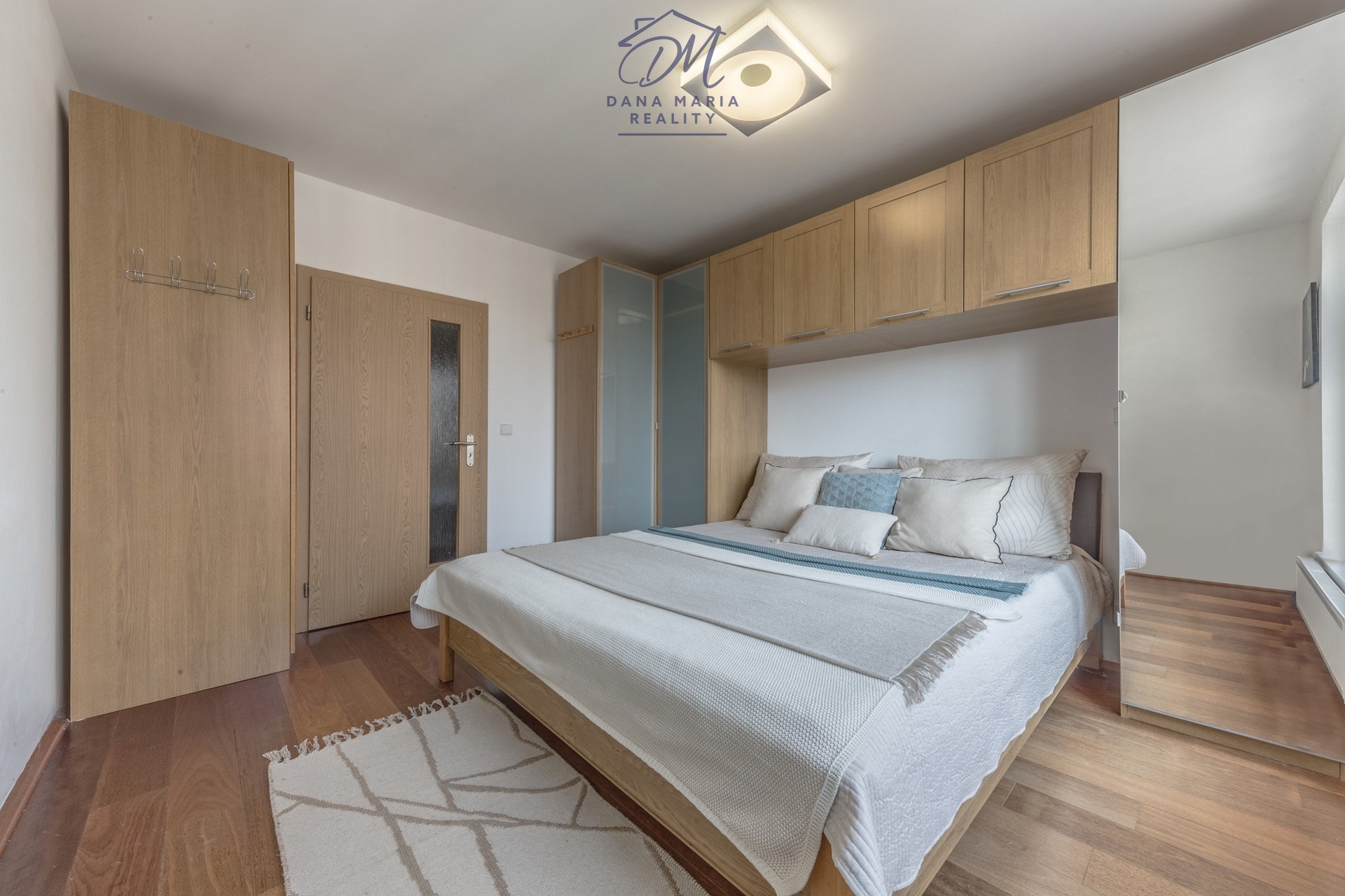 Ložnice je vybavena vestavěnými skříněmi na míru, které poskytují dostatek úložného prostoru, a pohodlnou dvoulůžkovou postelí. Kuchyňská linka je plně vybavena spotřebiči, včetně indukční varné desky a trouby značky Zanussi, myčky nádobí Electrolux a vestavěné lednice s mrazákem Whirlpool. Prostorná koupelna s vanou nabízí nadstandardní řešení v podobě podlahového vytápění, které zvyšuje tepelný komfort zejména v zimních měsících. Součástí koupelny je také pračka značky Candy.