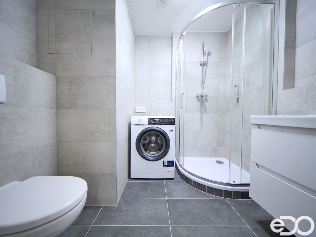 K dispozici je kuchyňská linka včetně vestavěných spotřebičů a pračka, jinak je byt nezařízený. Součástí pronájmu je i sklepní kóje.