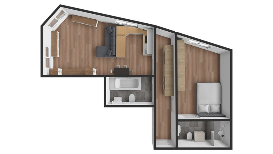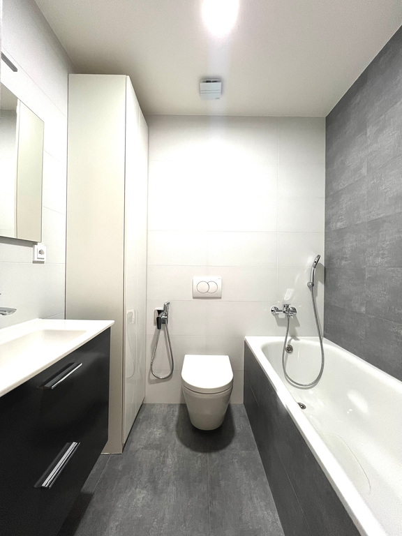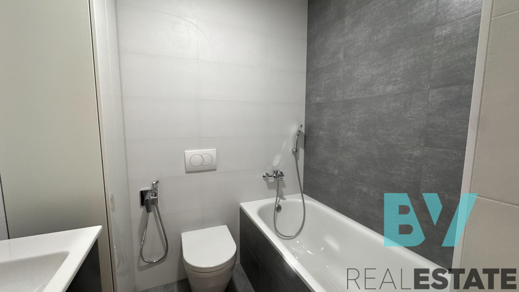 Dispozičně je byt řešen jako obývací pokoj s moderním kuchyňským koutem a jídelní částí, samostatná ložnice, předsíň a dvě koupelny – jedna vybavená vanou, druhá sprchovým koutem a toaletou. Kuchyňská linka je vybavena spotřebiči včetně varné desky, trouby a lednice. Obývací část nabízí pohodlnou sedací soupravu a dostatek úložného prostoru, ložnice je zařízena novou manželskou postelí a šatními skříněmi. V předsíni se nachází další úložné prostory. Okna jsou zdrojem přírodního světla a světlý interiér působí vzdušným dojmem. Byt je ideální pro jednotlivce nebo pár, který ocení kvalitní bydlení s výbornou dostupností do centra města.