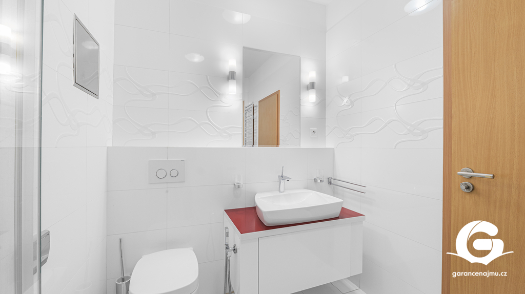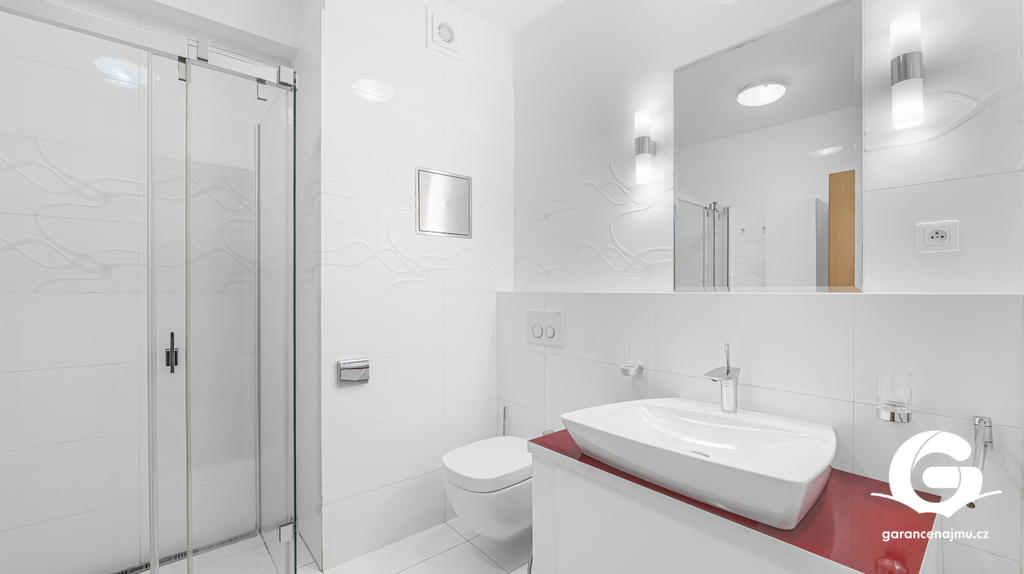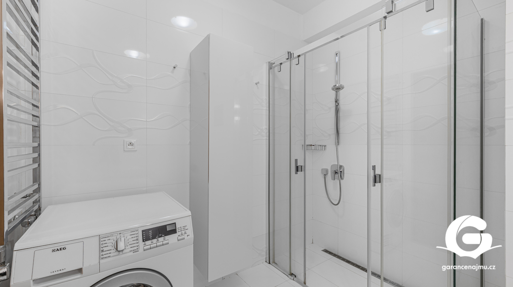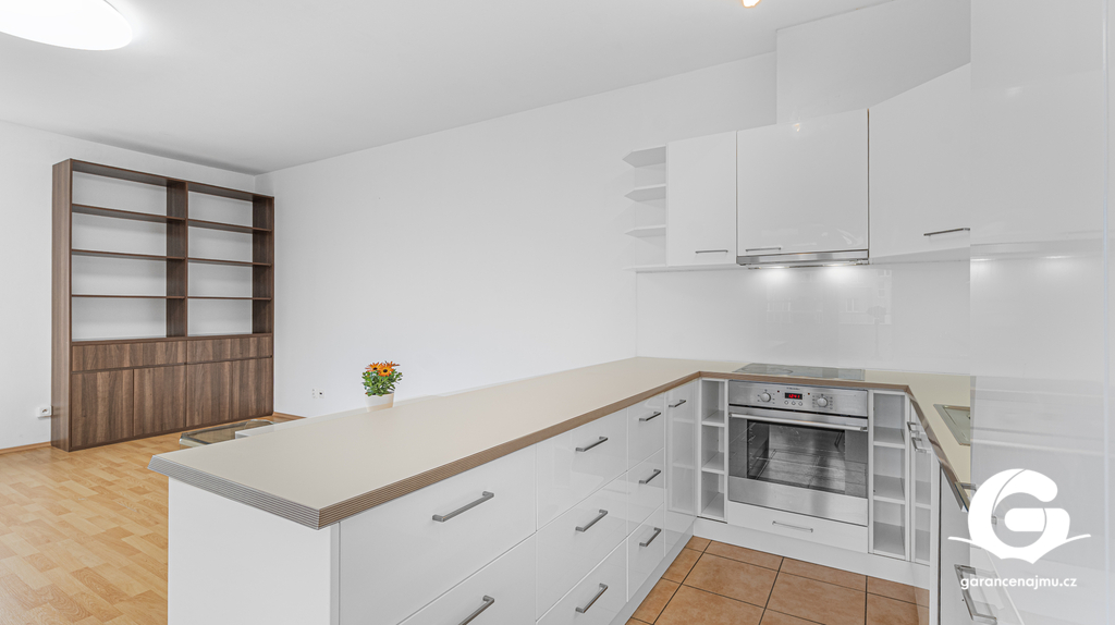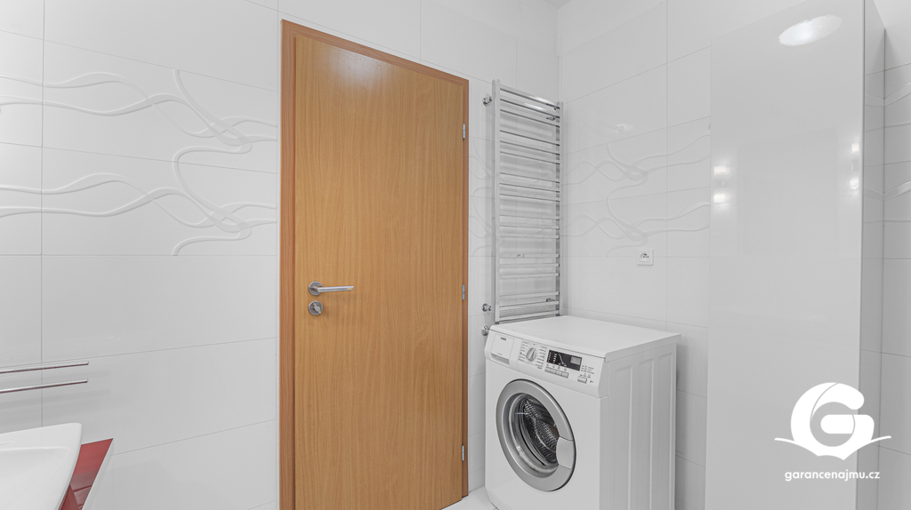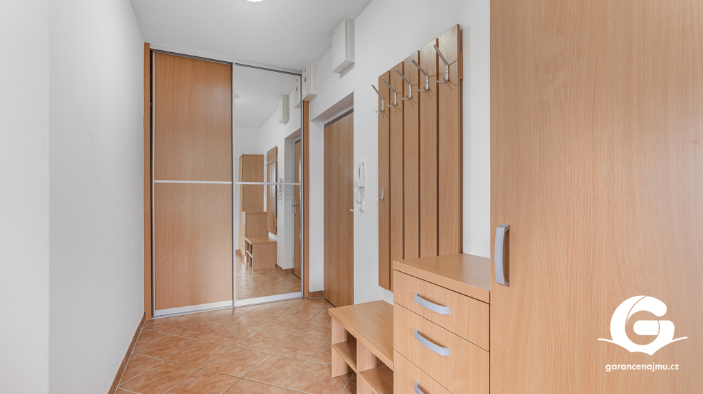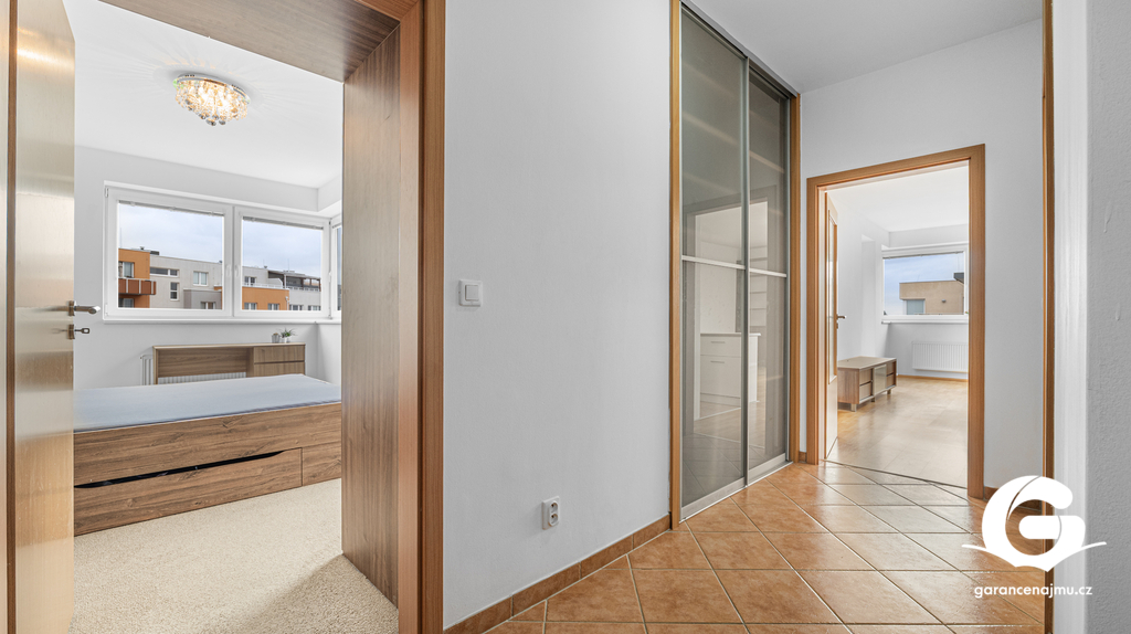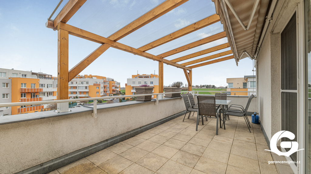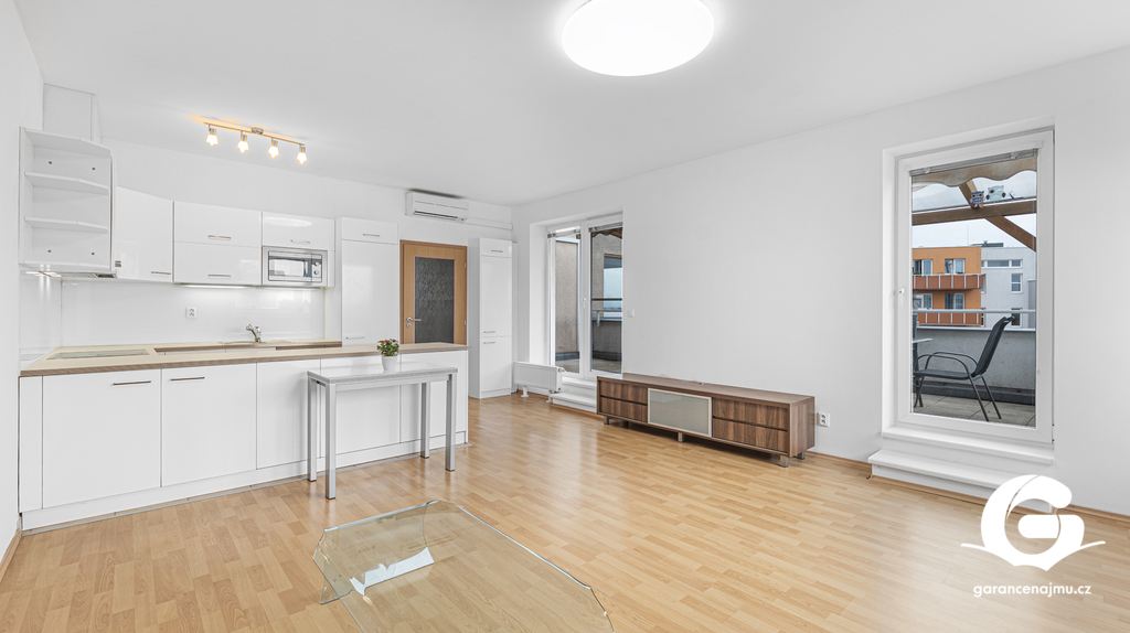 Byt tvoří předsíň s vestavěnými skříněmi, vzdušný obývací pokoj s kuchyňským koutem a samostatná ložnice – obě obytné místnosti jsou vybaveny klimatizační jednotkou, takže v létě i v zimě vždy příjemná teplota. Na prostornou terasu 10 m² s dřevěnou pergolou a polykarbonátovou střechou se dostanete jak z obývacího pokoje, tak z ložnice, ideální místo pro ranní kávu nebo večerní posezení s výhledem do klidného okolí a přilehlé zeleně. Moderní koupelna je vybavena sprchovým koutem, závěsným WC, umyvadlem a pračkou. Myčka nádobí není součástí vybavení. K bytu náleží sklepní koje a vyhrazené parkovací stání přímo u domu se závěrnou rampou.
