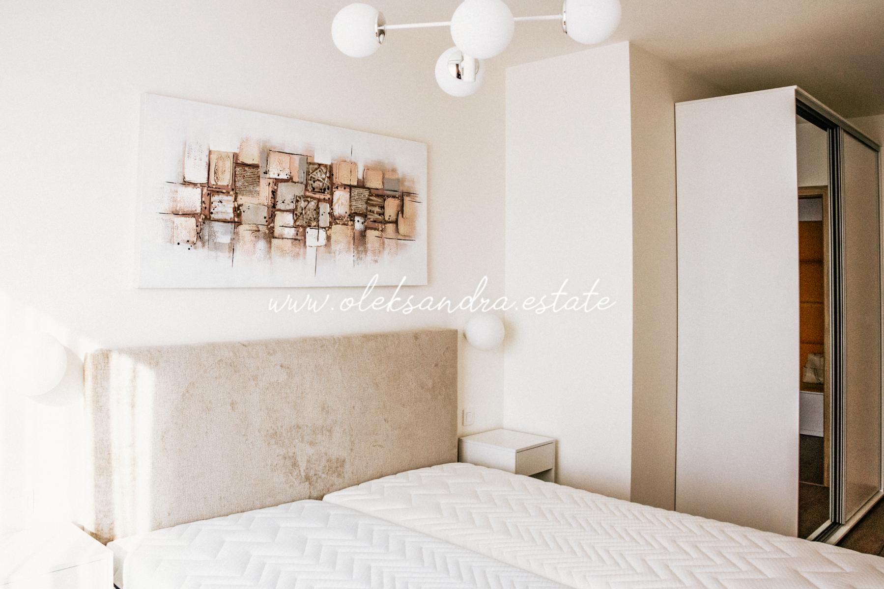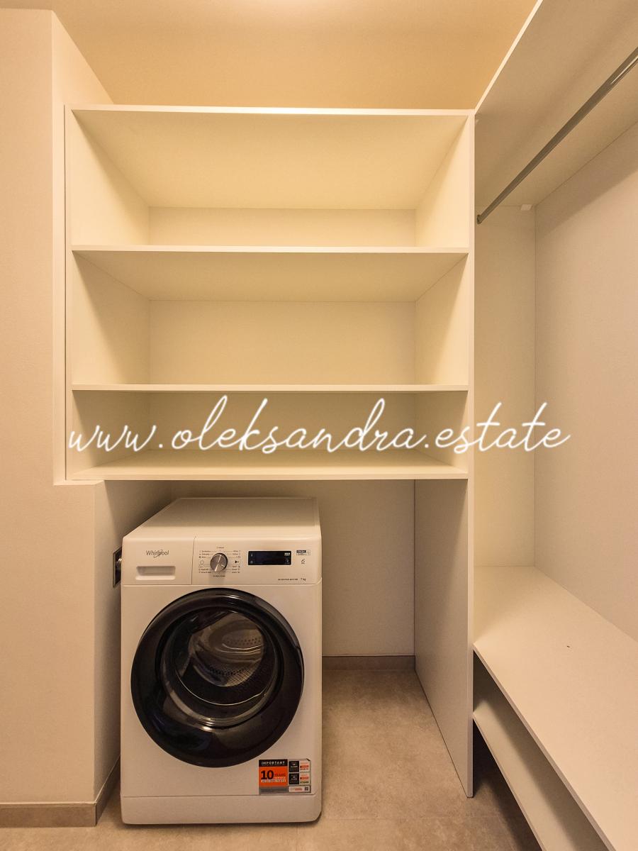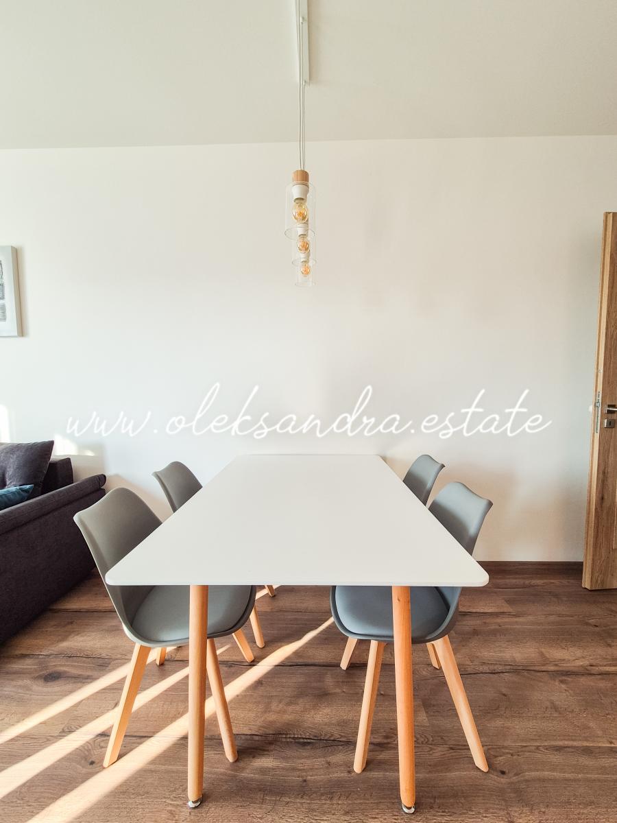 Jedná se kompletně zařízený byt. Nábytek na míru nabízí dostatek úložného prostoru. V bytě je velký a chytře řešený kuchyňský kout vybaven lednicí, myčkou, troubou, indukční deskou a digestoří. Další část bytu tvoří obývací prostor s rozkládací pohovkou, odkladacím stolkem a stolkem pod TV. Ložnice je zařízená velkou postelí s úložným prostorem a velkou šatní skříní. Celkově je byt velice moderně zařízený kvalitním nábytkem. V bytě je také velká komora s pračkou.