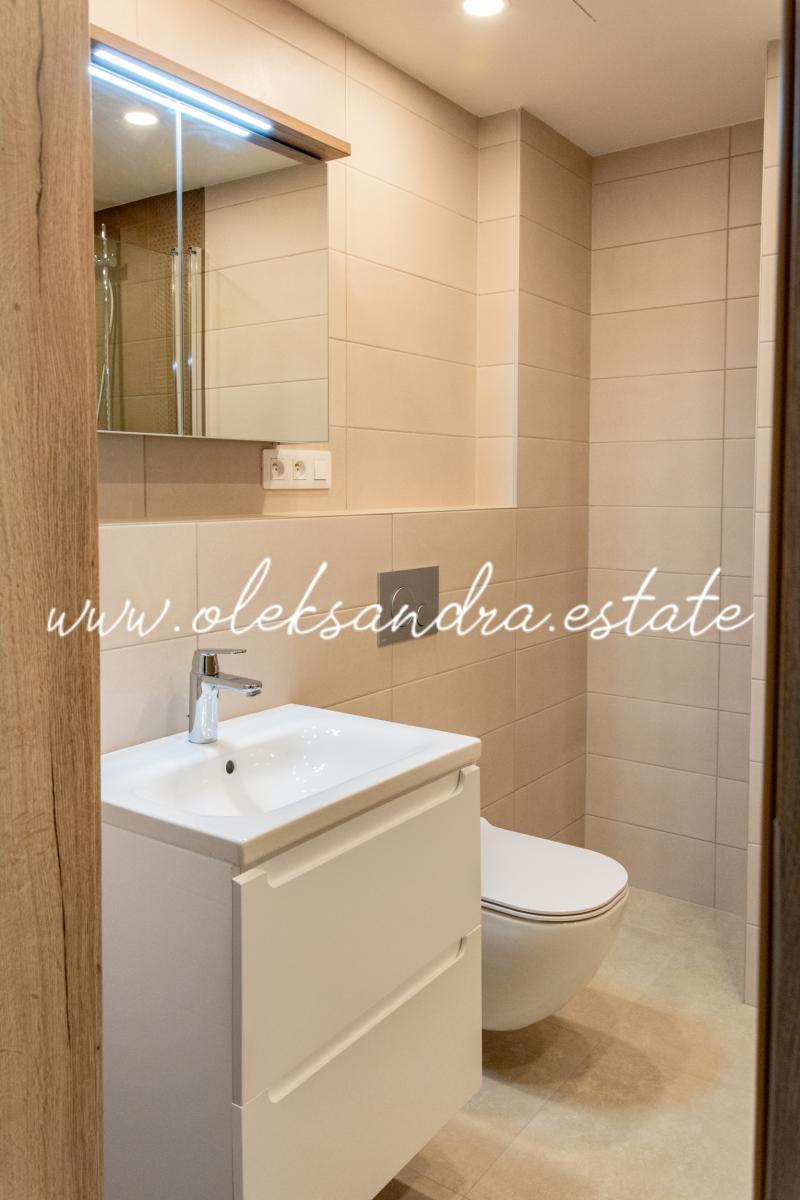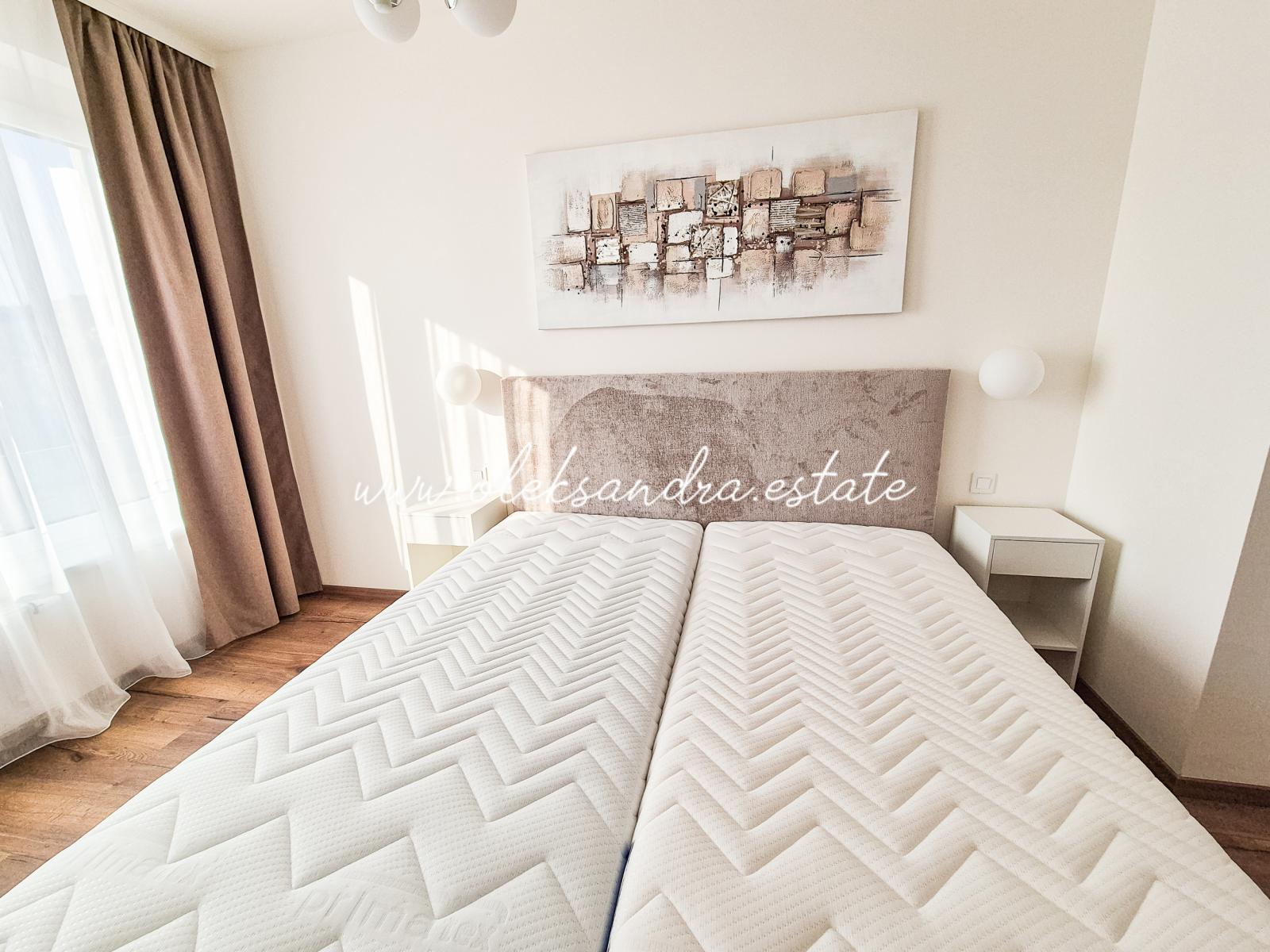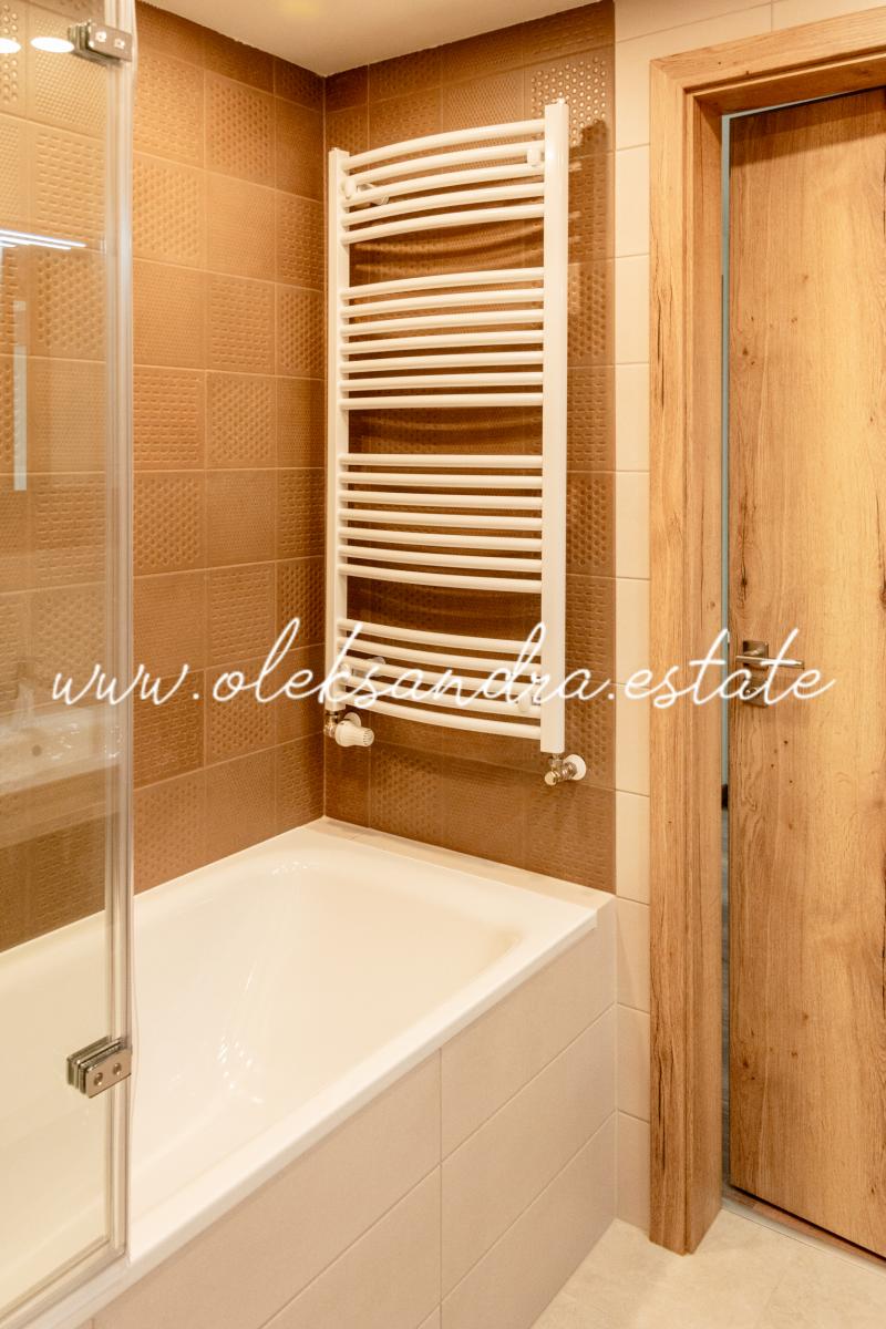 Jedná se kompletně zařízený byt. Nábytek na míru nabízí dostatek úložného prostoru. V bytě je velký a chytře řešený kuchyňský kout vybaven lednicí, myčkou, troubou, indukční deskou a digestoří. Další část bytu tvoří obývací prostor s rozkládací pohovkou, odkladacím stolkem a stolkem pod TV. Ložnice je zařízená velkou postelí s úložným prostorem a velkou šatní skříní. Celkově je byt velice moderně zařízený kvalitním nábytkem. V bytě je také velká komora s pračkou.