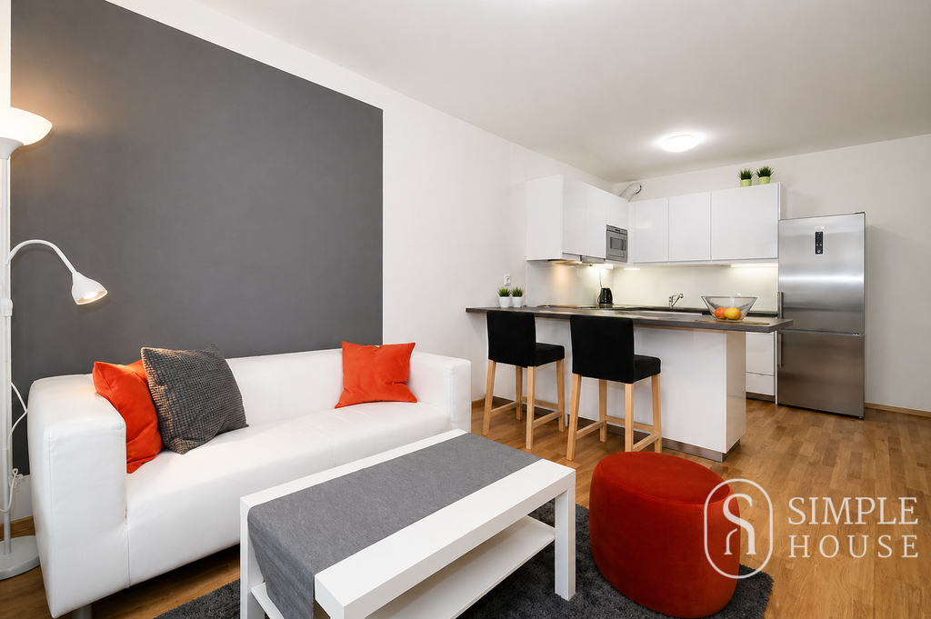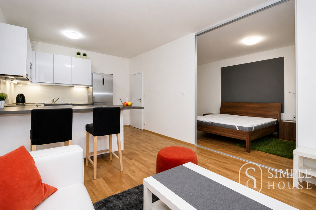 Byt se pronajímá vybavený. K dispozici je kuchyňská linka na míru se spotřebiči značky Electrolux – myčka, sklokeramická varná deska, trouba, lednice, digestoř a mikrovlnná trouba. Obývací část je vybavena sedacím nábytkem, ložnice vestavnou skříní, postelí a komodou. V chodbě je předsíňový nábytek a zařízená šatna/komora.