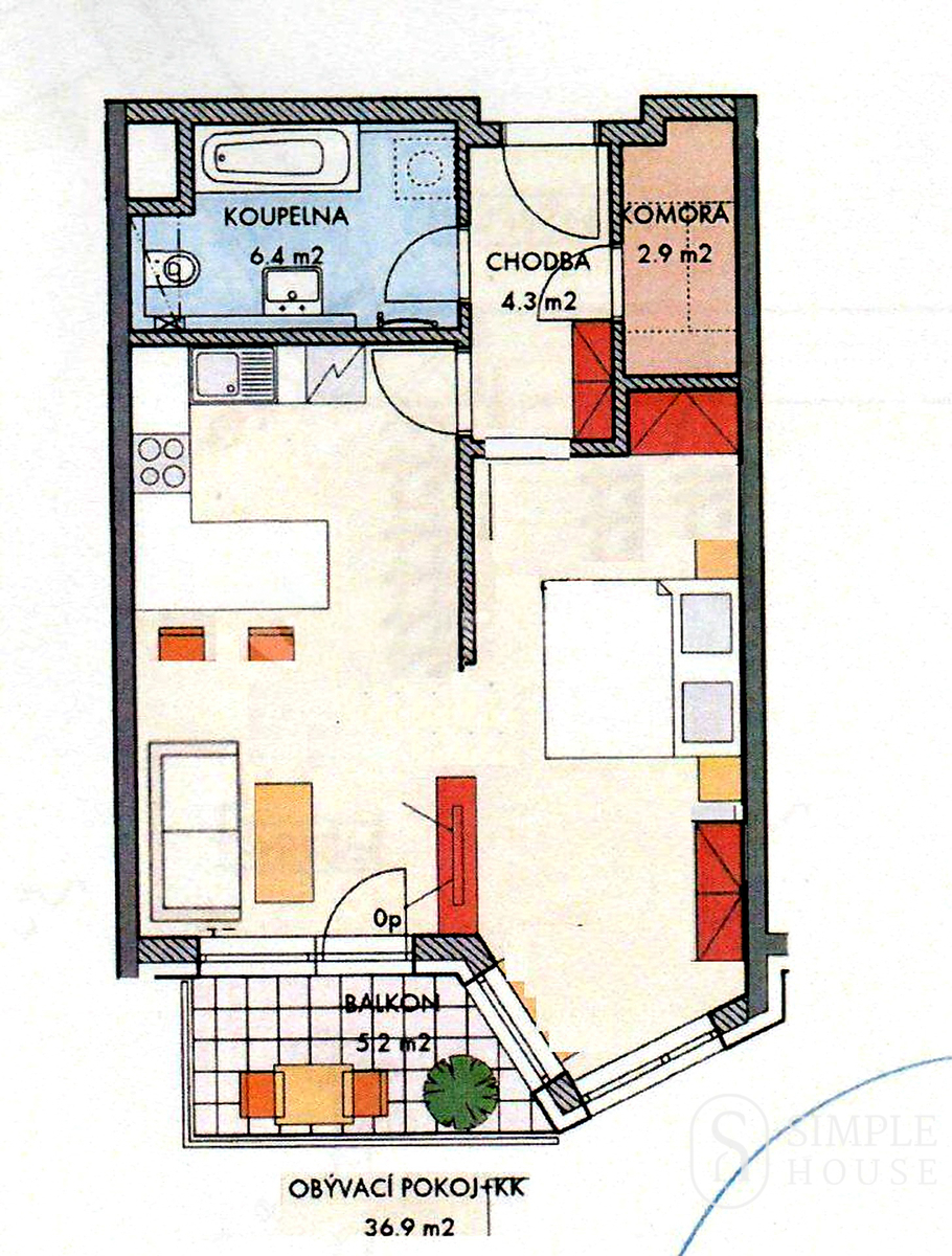 K bytu náleží balkon o velikosti 5,2 m² a garážové stání, které je zahrnuto v ceně nájmu. Byt je orientován na jihovýchod.