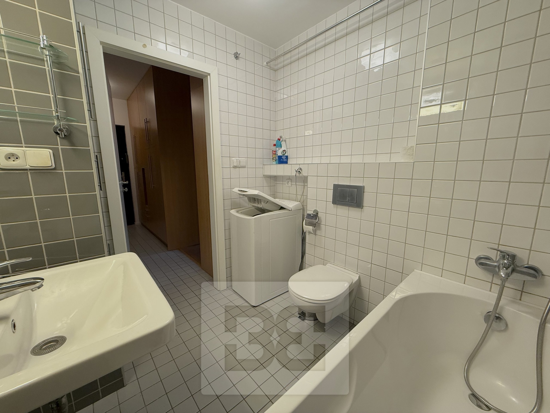 • Koupelna s vanou, toaletou, umyvadlem, pračkou a vestavnou úložnou skříní