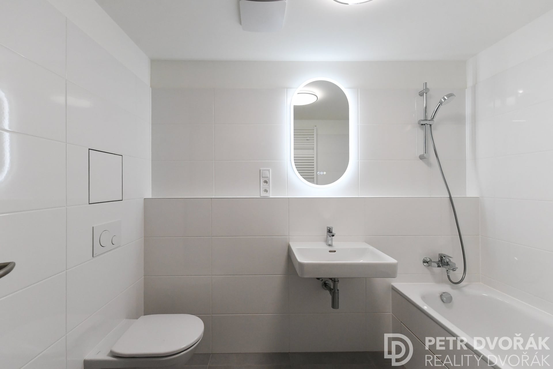 Koupelna disponuje vanou se sprchovou baterií, umyvadlem, podsvíceným zrcadlem, zavěšenou toaletou a žebříkovým radiátorem.