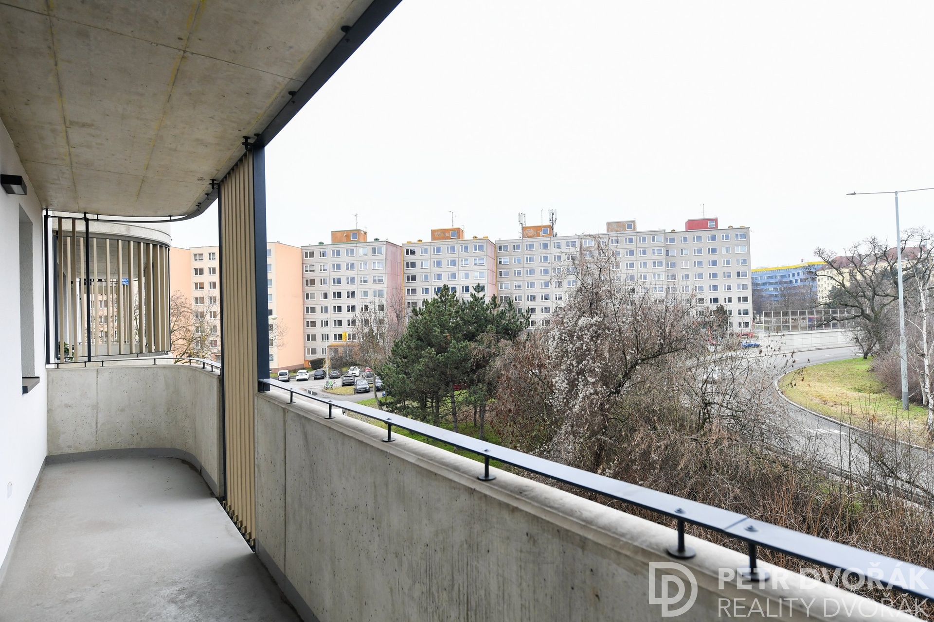 Součástí bytu je prostorný balkon (10 m²) s výhledem do zeleně, přístupný z obývacího pokoje francouzskými okny.
