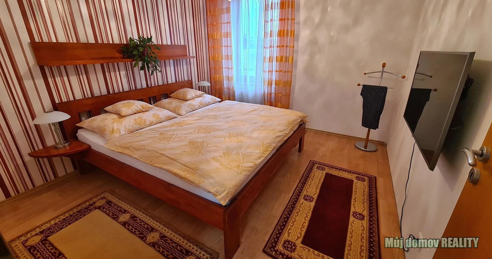 Ložnice nabízí manželskou postel a nástěnnou TV Samsung QLED 43 and #34;.