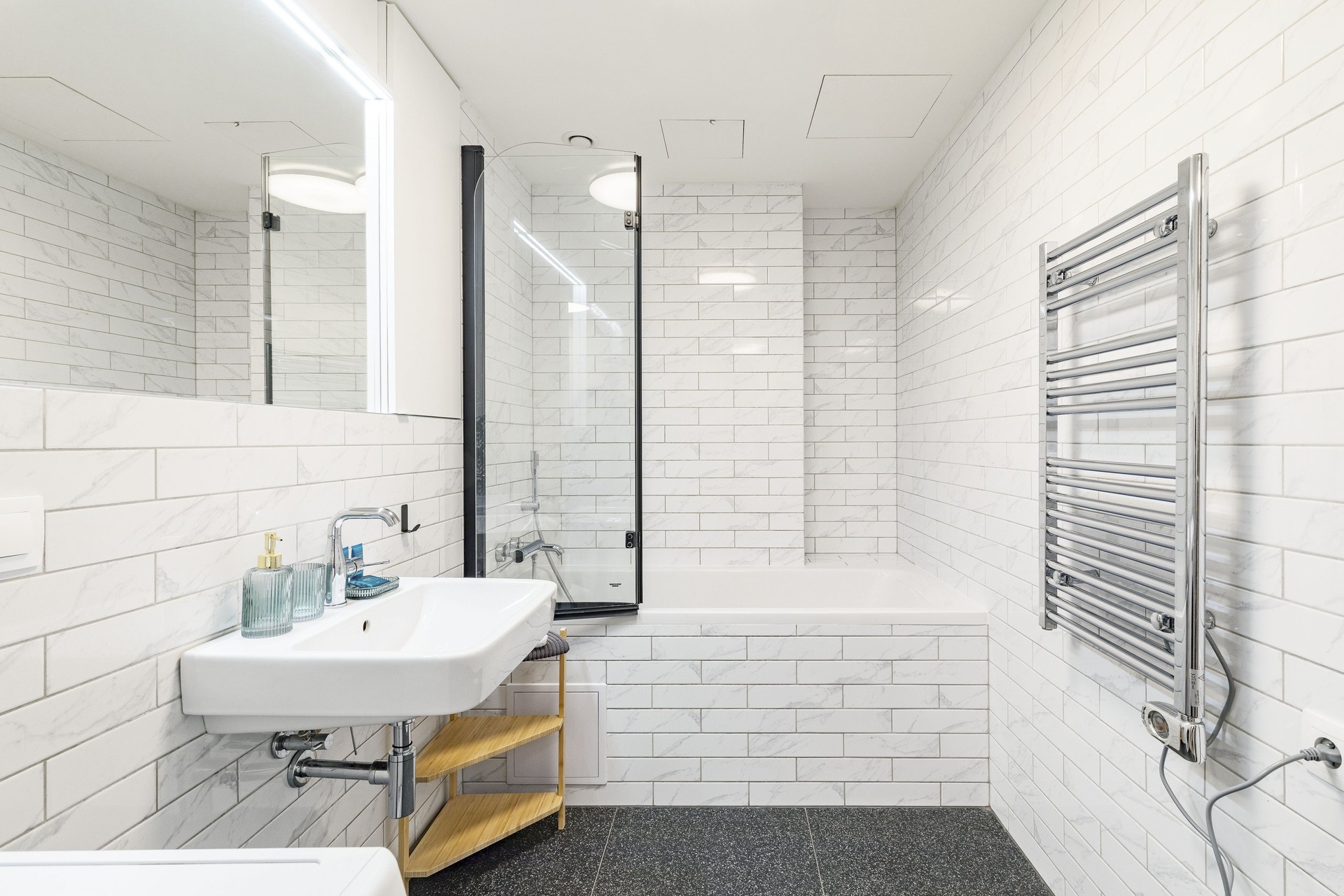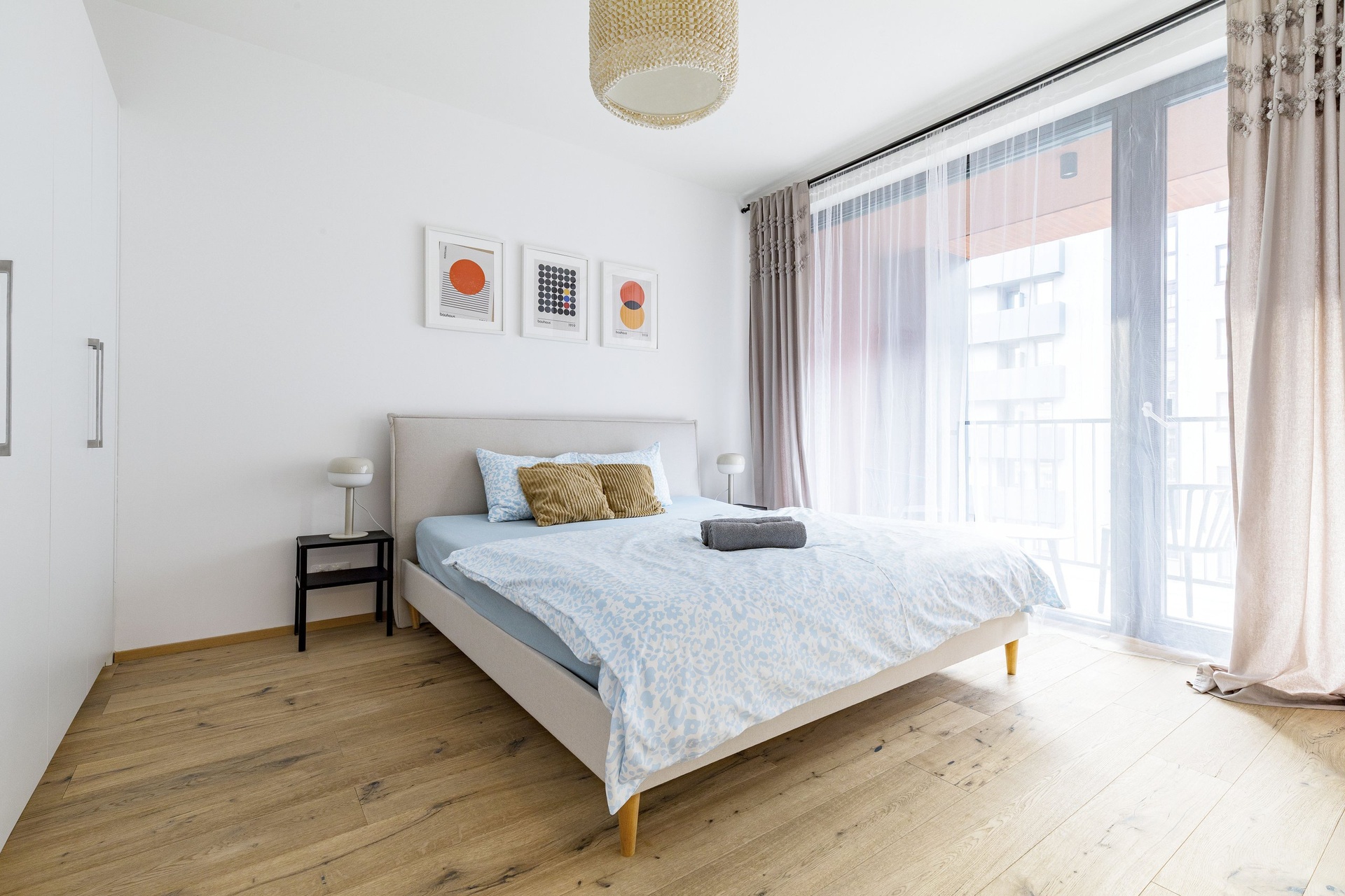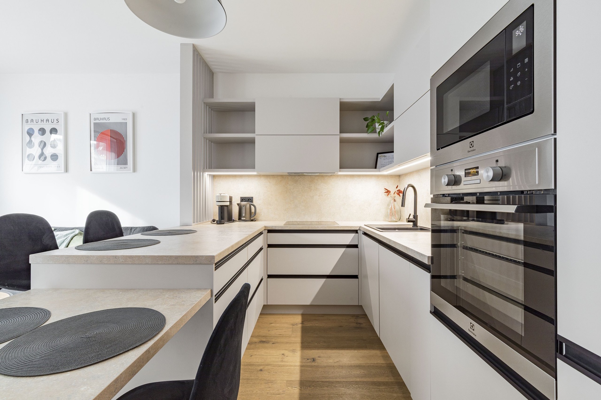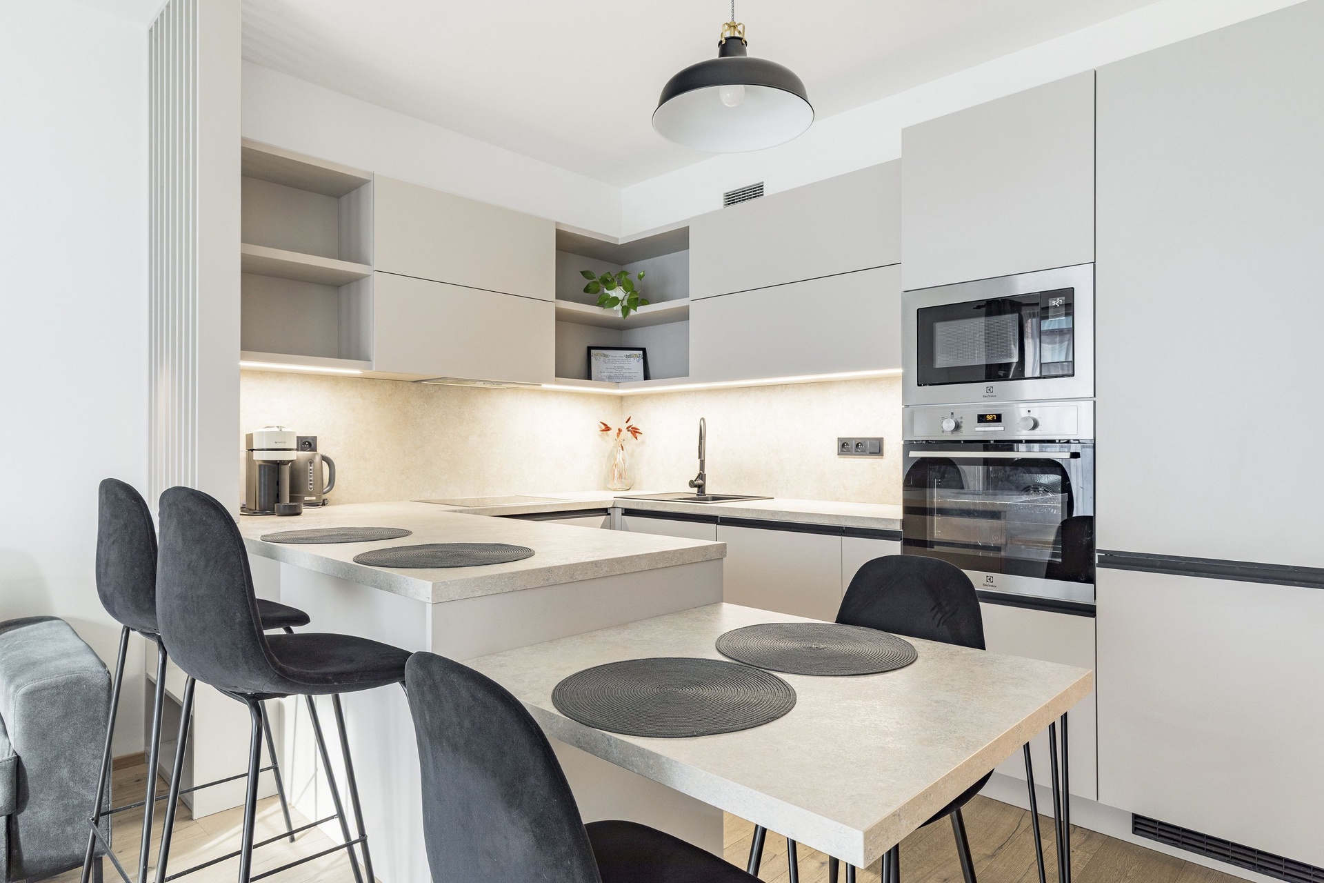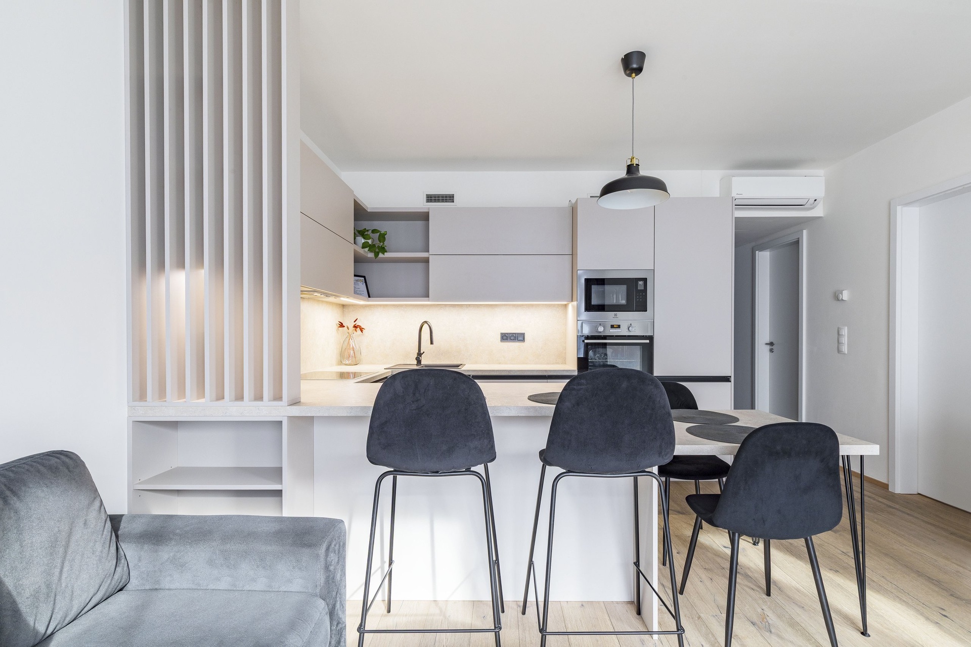 Velkým benefitem bytu je jeho nadstandardní vybavení – v celém bytě je podlahové topení, nechybí klimatizace pro komfort během letních měsíců a na oknech jsou instalovány venkovní rolety, které zajišťují soukromí i regulaci teploty. Součástí vybavení je také pračka se sušičkou, kompletní nábytek včetně postele, sedačky, jídelního stolu a dalších prvků, takže byt je připraven k okamžitému nastěhování bez nutnosti dalších investic.