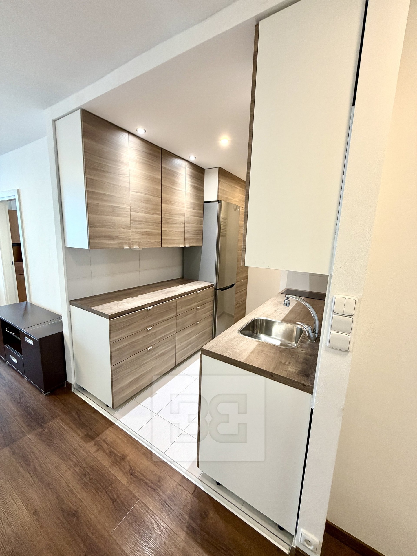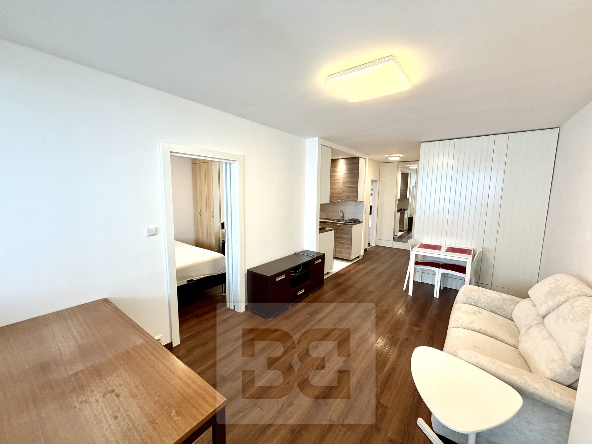 Byt o celkové ploše 45 m² prošel v posledních letech kompletní rekonstrukcí s důrazem na praktické řešení a dostatek úložných prostor. Dispozice bytu nabízí vstupní předsíň s vestavěnými skříněmi, koupelnu s vanou, samostatné WC s pračkou a světlý obývací pokoj s kuchyňským koutem. Kuchyň je vybavena myčkou na nádobí (60cm), pečicí a mikrovlnnou troubou a lednicí. Z obývací části je vstup do ložnice.