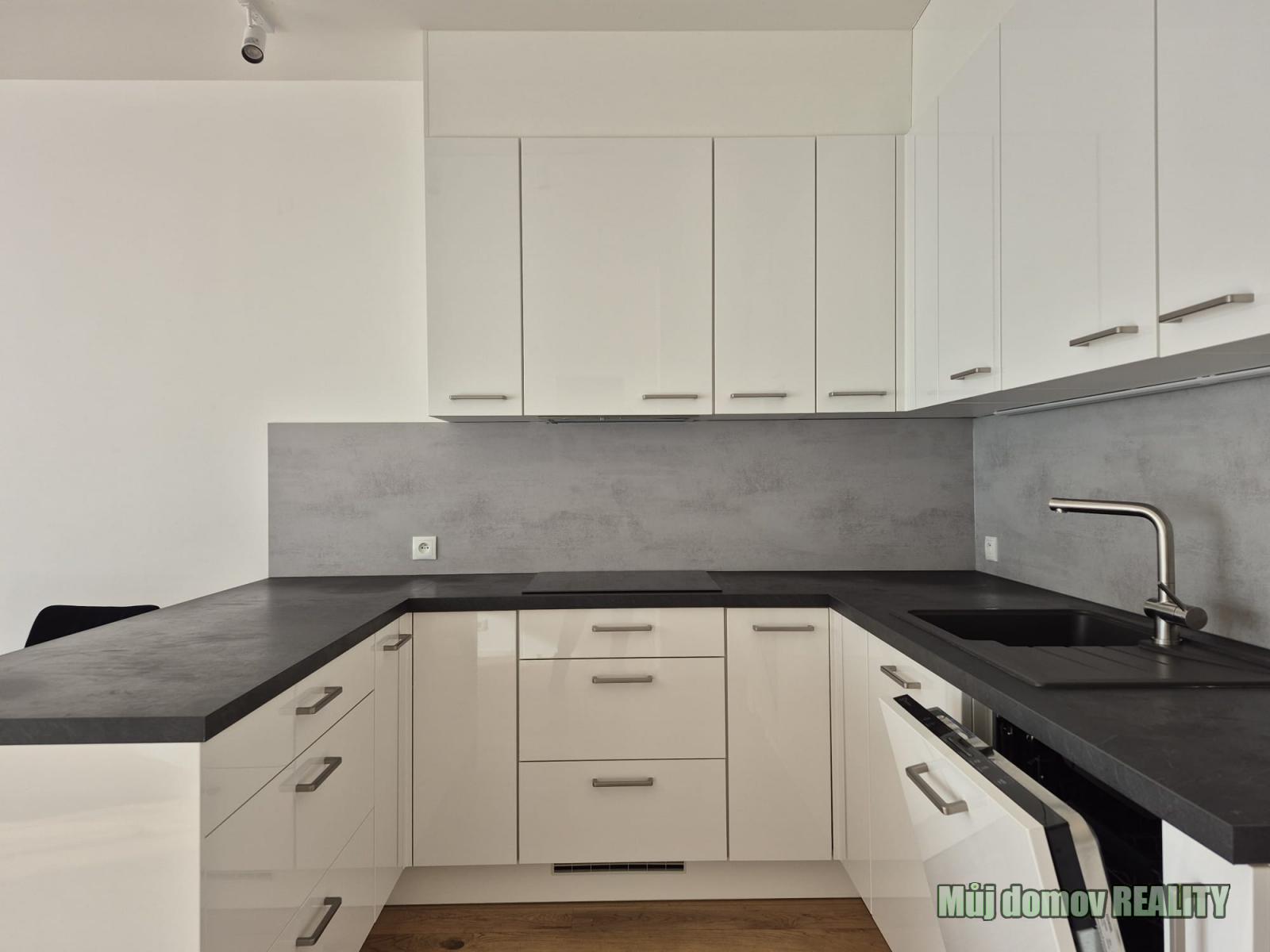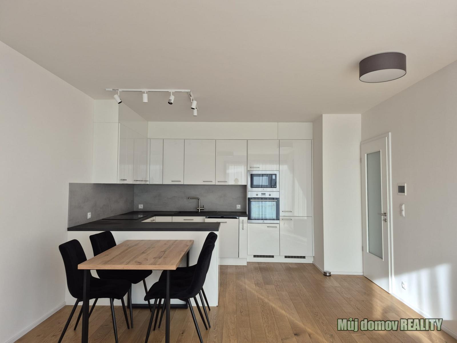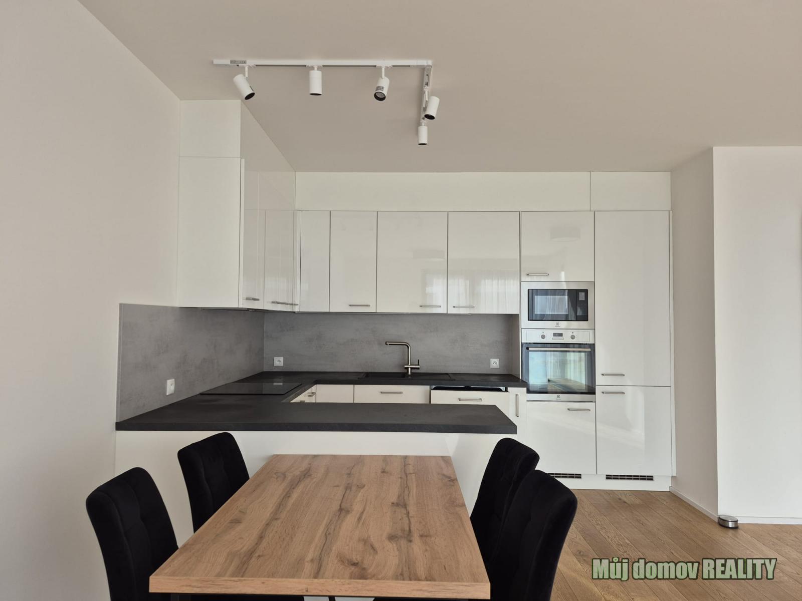 Novou kuchyňskou linkou se všemi spotřebiči, jídelním stolem s židlemi a TV skříňkou