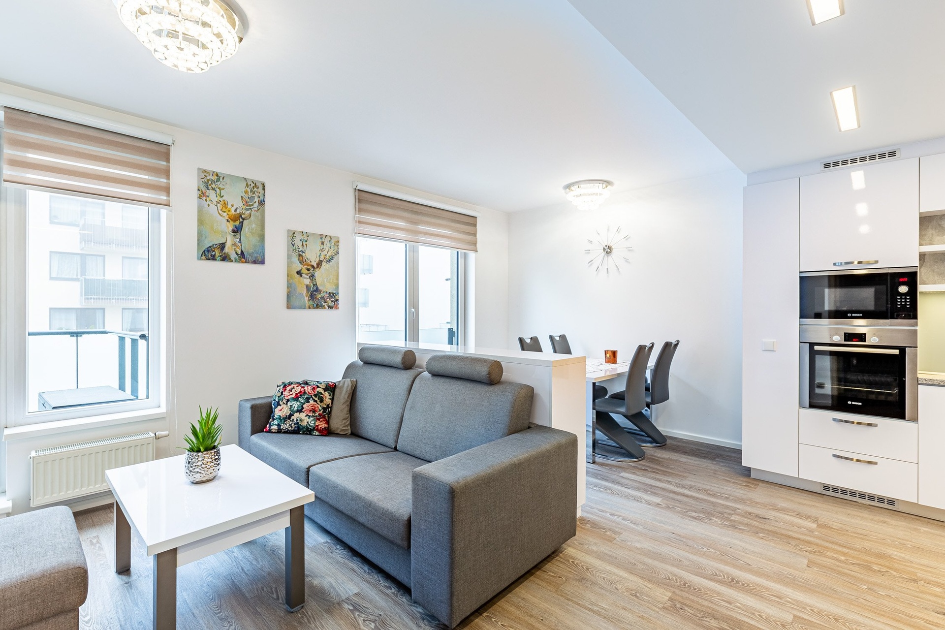 Dispozici bytu tvoří obývací pokoj s kuchyňským koutem a vstupem na terasu, ložnice, koupelna s vanou a toaletou, vstupní předsíň. V prostorné kuchyňské lince jsou zabudované vestavné spotřebiče vysoké kvality, v koupelně je podlahové topení a otopný žebřík. Byt se pronajímá plně zařízený - nábytek na míru, TV, v koupelně je pračka/sušička.