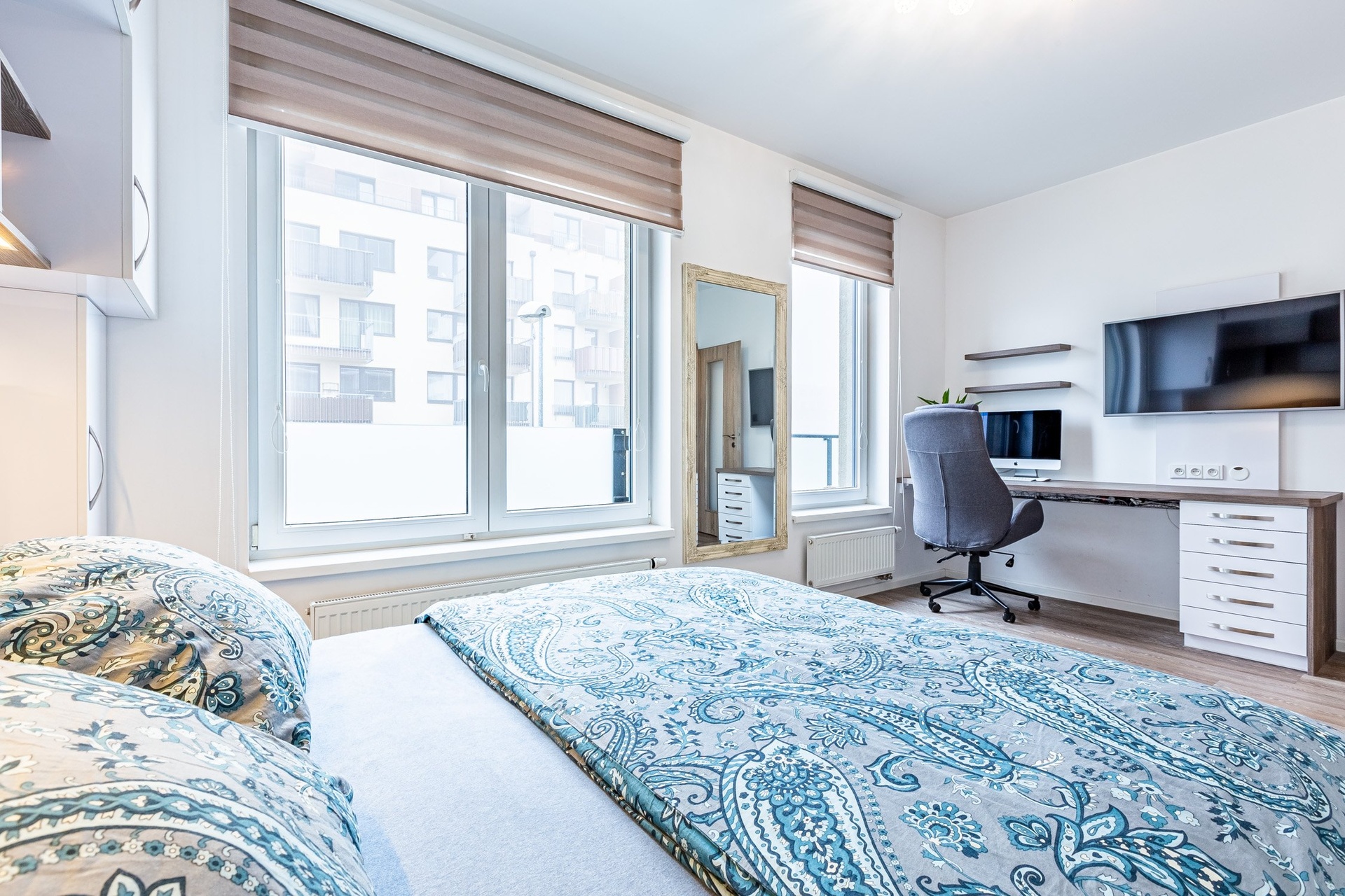 Pronájem bytu 2+kk s terasou a garážovým parkovacím stáním v rezidenčním projektu Britská čtvrť v ulici Svitákova, Praha 13 - Stodůlky.