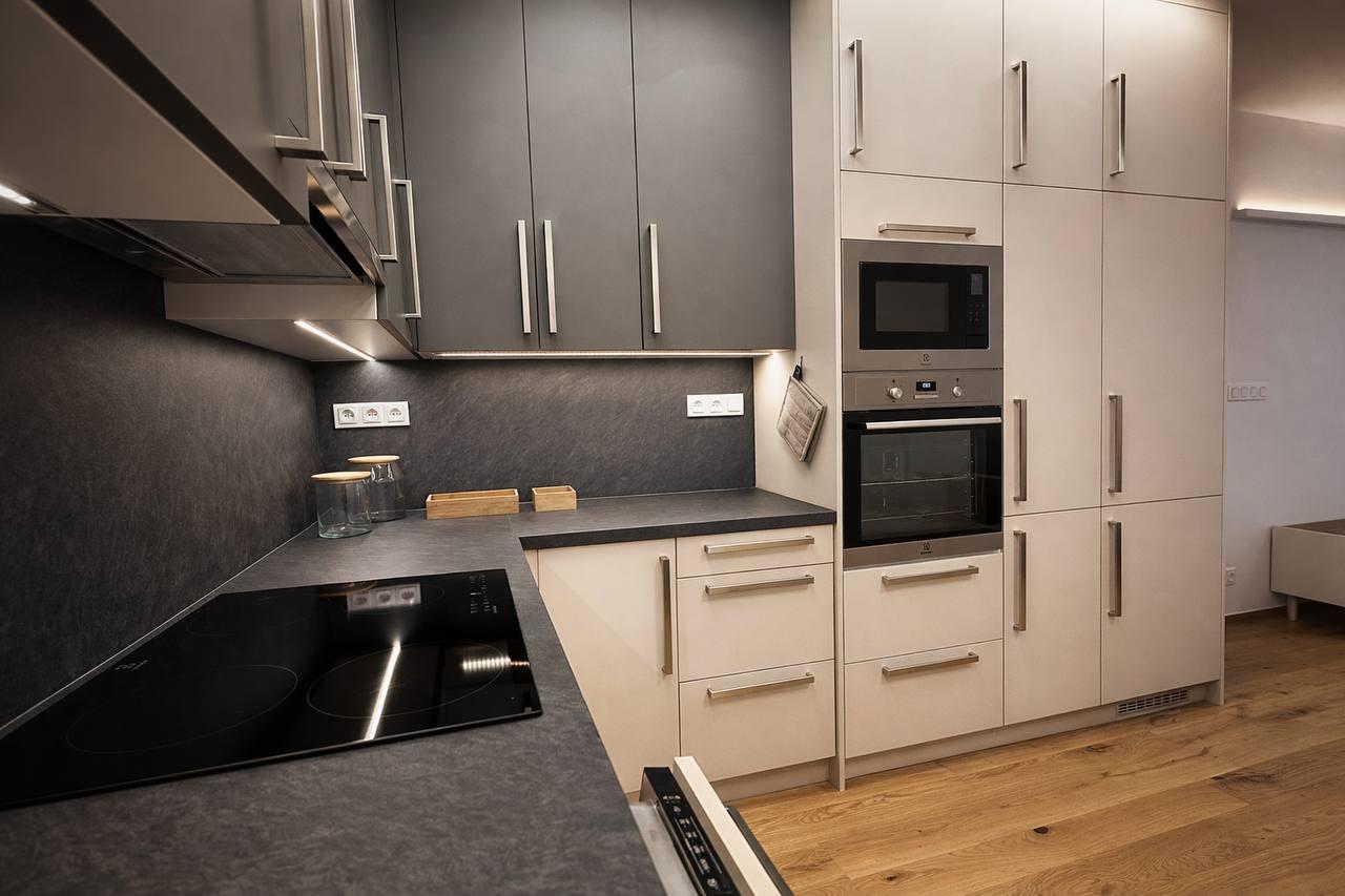 Plně vybavená kuchyňská linka se spotřebiči Whirlpool (indukční varná deska, myčka, trouba, mikrovlnná trouba, digestoř) splňuje požadavky moderního městského bydlení a nabízí maximální pohodlí.