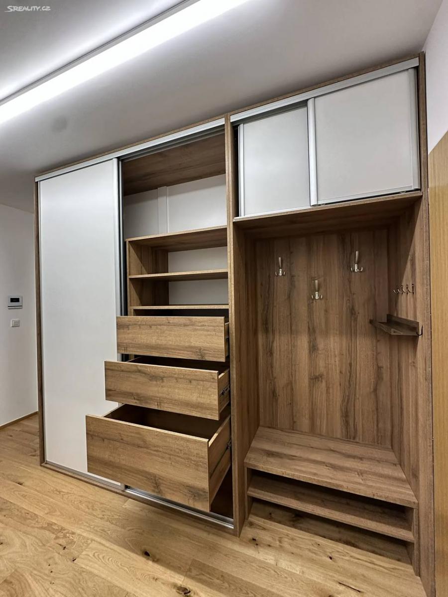 Interiér nabízí kvalitní dřevěné podlahy, elegantní vestavěný nábytek a designové LED osvětlení s možností stmívání, které vytváří klidnou a sofistikovanou atmosféru ideální jak pro práci z domova, tak pro relaxaci po náročném dni.