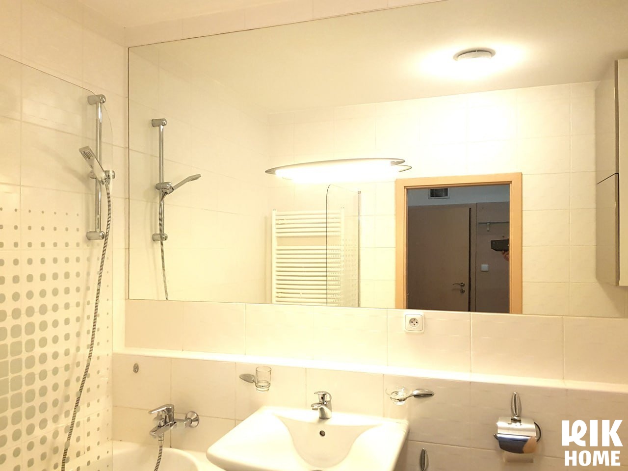 Vana s transparentní zástěnou a velkým zrcadlem přes celou stěnu.