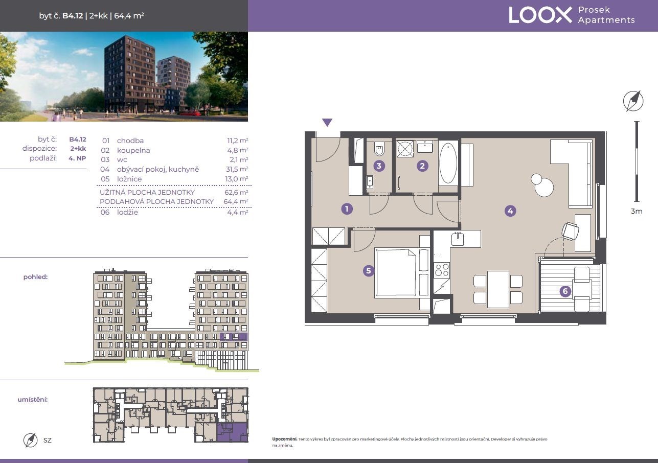 Nabízíme k pronájmu kompletně vybavený byt o dispozici 2+KK s výměrou 64 m2 a lodžií 4,4 m2 ve 4.NP v 11patrovém bytovém domě LOOX přímo u metra Prosek.