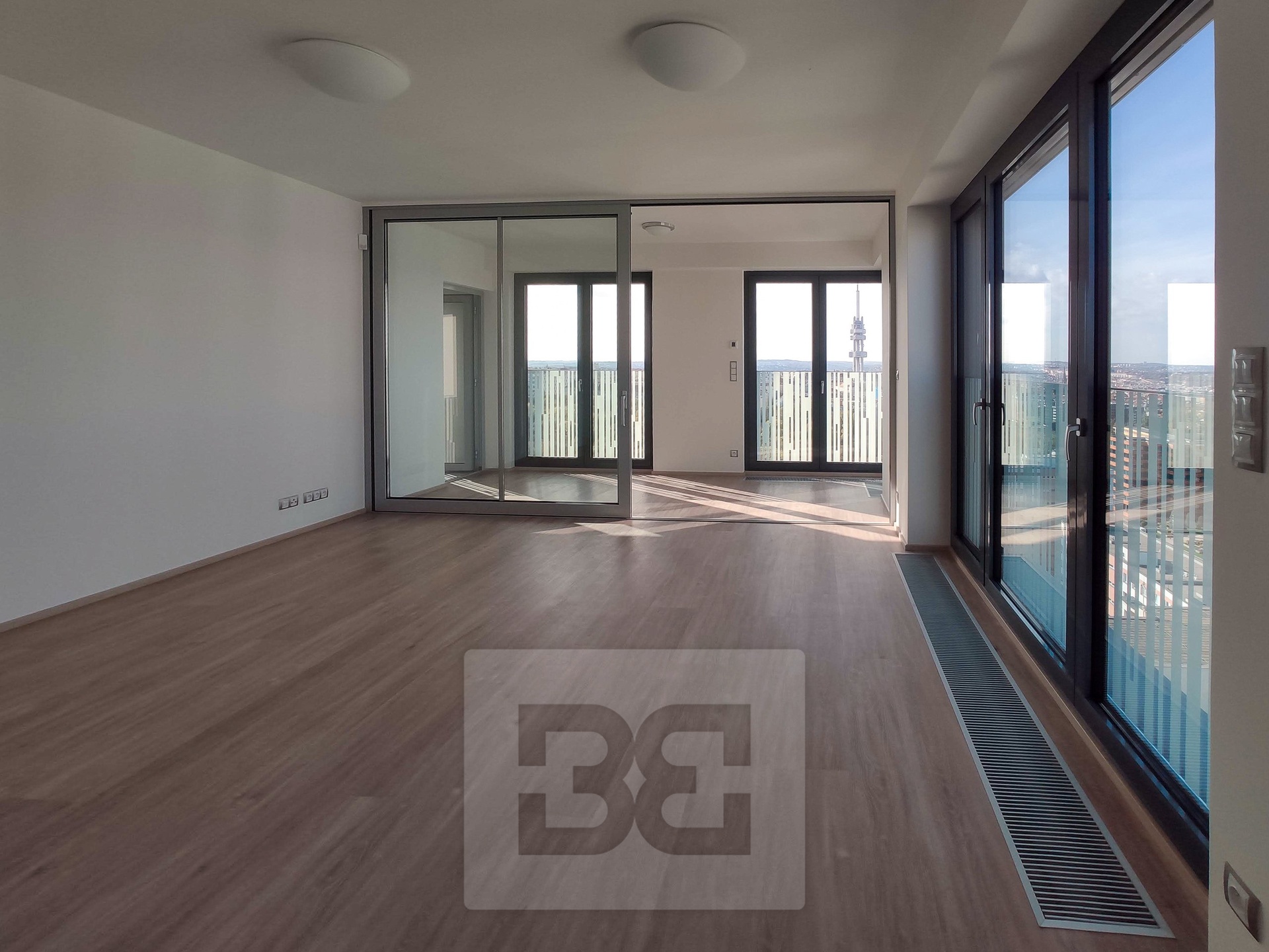 Byt se nachází v nejvyšším, 17. patře novostavby Residence Garden Towers, na Praze 3 v ulici Olšanská.