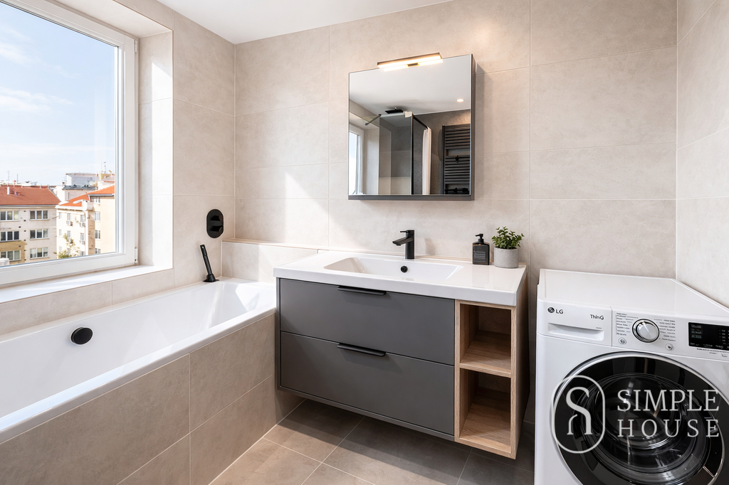 Byt je částečně vybaven, což umožňuje novému nájemci dotvořit interiér podle vlastního vkusu a potřeb. V moderní koupelně se nachází jak vana, tak sprchový kout, a nechybí zde ani okno, které přináší přirozené světlo a příjemnou vzdušnost.