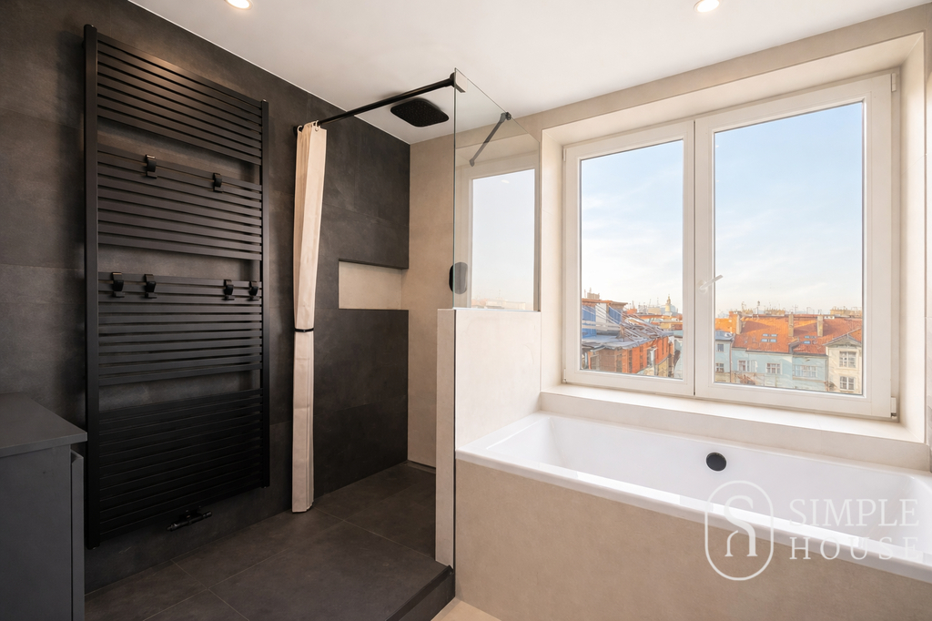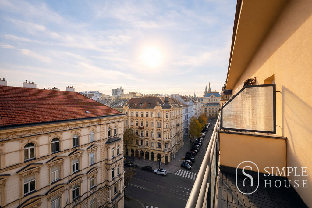 Dominantou bytu je prostorný obývací pokoj s kuchyňským koutem, který poskytuje dostatek prostoru pro pohodlné každodenní fungování i relaxaci. Z oken i z terasy o rozloze 3,8 m² se otevírá nádherný výhled na Národní muzeum a střechy Prahy, což umocňuje jedinečnost tohoto bydlení.